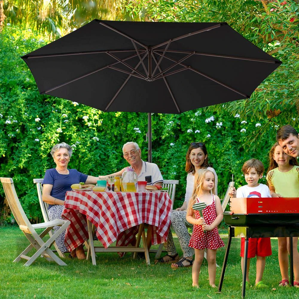 Get a new cantilever umbrella for your backyard or garden now. A wonderful solution for any leisure time outside under bright Sunshine. Even this umbrella can be used for commercial use, but outside of your store for those customers who want to sit outside the room. TIPS: Stand included(Crossbar), weighted base needs purchase separately.