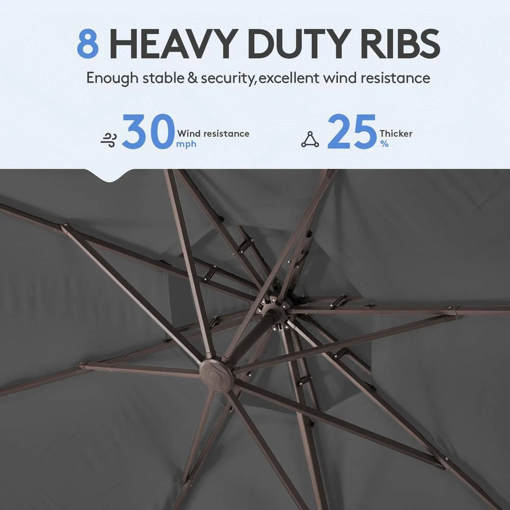 Relax outside day or night with our durable and chic 10 ft. cantilever patio umbrella. While the weather-resistant canopy protects you from the sun’s heat and harmful rays. Our umbrella can provide shade for a round or rectangle table with up to 9 chairs. You can use it in residential and commercial locations, e.g. gardens, yards, pool, deck, background beach, balcony, restaurant, and other outdoor areas. CAUTION and CARE – To make this type of umbrella stable, you must purchase a weighted base separately, use a sandbag or bricks, or nail the foundation to your deck. NOTE – The weighted base is not included in this item. We Highly Recommend you can search these OMSIDs to match it: 328563934