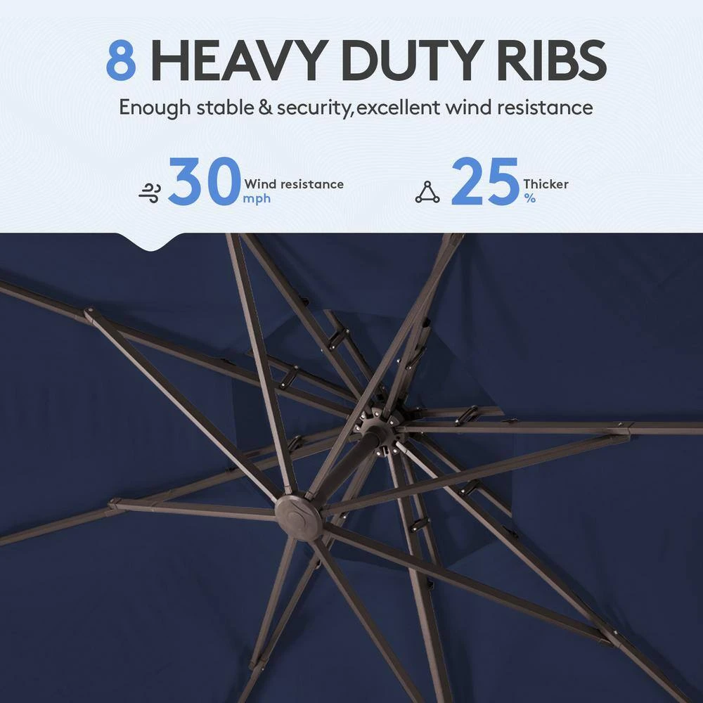 Relax outside day or night with our durable and chic 10 ft. cantilever patio umbrella. While the weather-resistant canopy protects you from the sun’s heat and harmful rays. Our umbrella can provide shade for a round or rectangle table with up to 9 chairs. You can use it in residential and commercial locations, e.g. gardens, yards, pool, deck, background beach, balcony, restaurant, and other outdoor areas. CAUTION and CARE – To make this type of umbrella stable, you must purchase a weighted base separately, use a sandbag or bricks, or nail the foundation to your deck. NOTE – The weighted base is not included in this item. We Highly Recommend you can search these OMSIDs to match it: 328563934