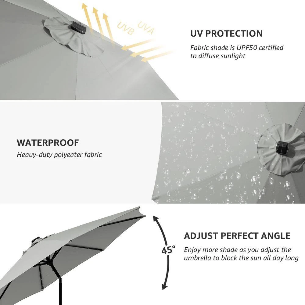 - SOLAR POWERED LIGHTS Lights: Our patio umbrella is designed with solar powered lights. Let this outdoor umbrella exposed to the sun at day time. Convenient and energy saving.