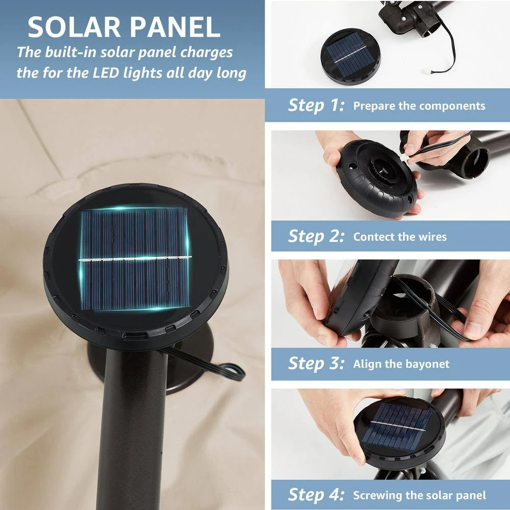 - 32 LED lights with 8 steel ribs help to light up a relaxing night the square solar panel at the top can work for 6-8 hours when the battery is in full status the built-in battery will be charged during the daytime by the provided solar module