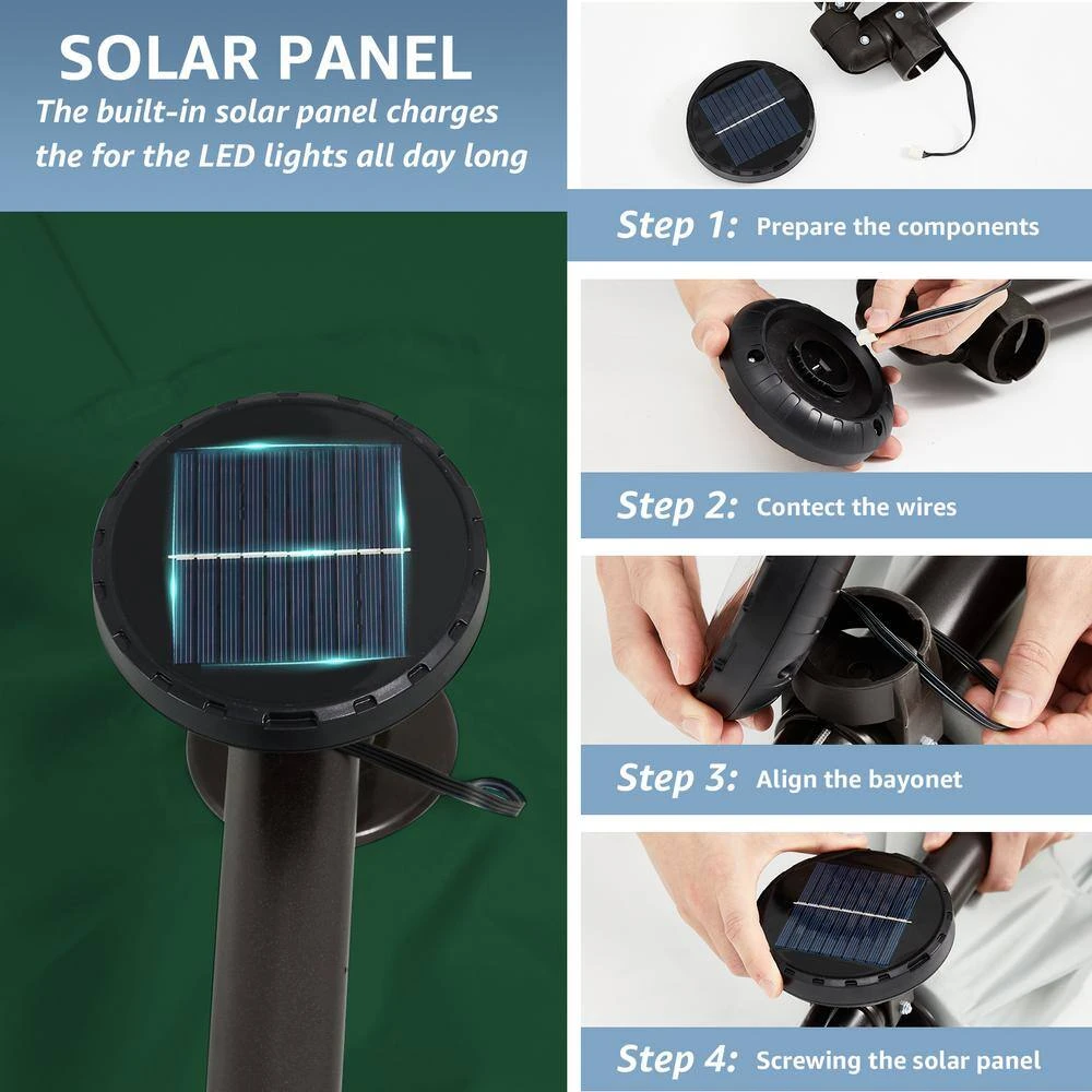 - 32 LED lights with 8 steel ribs help to light up a relaxing night the square solar panel at the top can work for 6-8 hours when the battery is in full status the built-in battery will be charged during the daytime by the provided solar module
