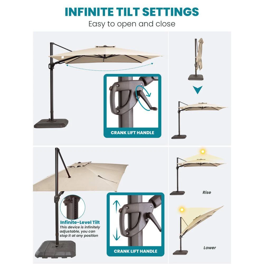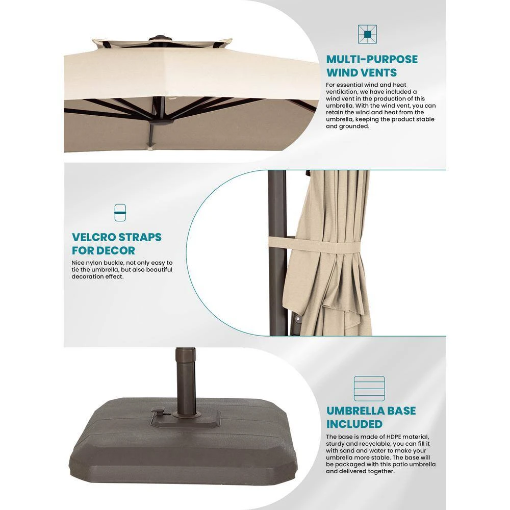 - Umbrella base included- this 10 ft. x 10 ft. patio cantilever umbrella is fitted with a weighted base and ships with the patio parasol the base is made of HDPE material, strong and recyclable, you need to fill it with sand and water to make your large outdoor umbrella more stable