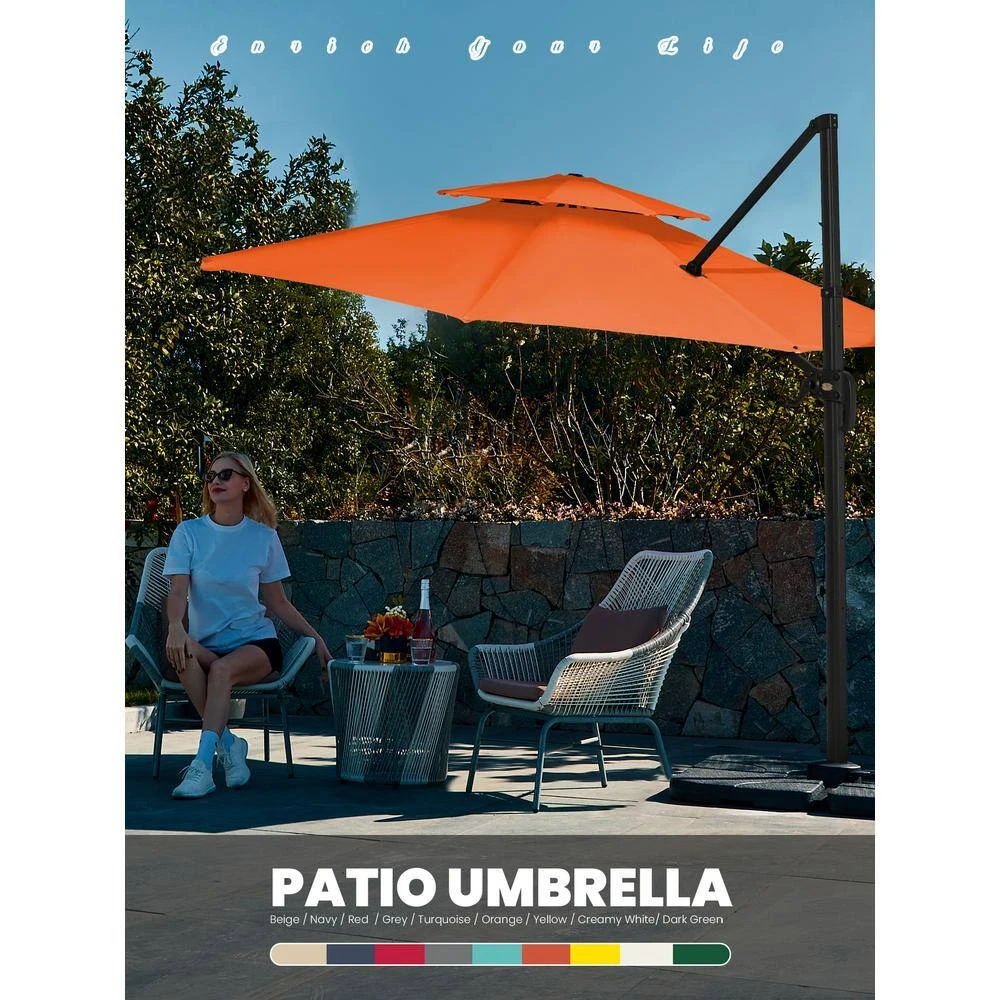 This patio umbrella brings wonderful outdoor leisure time. It is made of a powder-coated aluminum frame and 8 heavy-duty ribs, which are more durable and sturdier to use longer. The double top umbrella features a wind vent for better air circulation to provide a cool environment under the umbrella. A durable polyester canopy provides more shade areas for you and your friends. In addition, it is fade-resistant, water-proof, and sun-protection to be perfectly used outdoor without too much glare sunlight. 360-degree rotation function satisfy your various needs.Note: Weighted base Not included. We Highly Recommend you can search these OMSIDs to match it: 320892032 (250lbs weighted base)