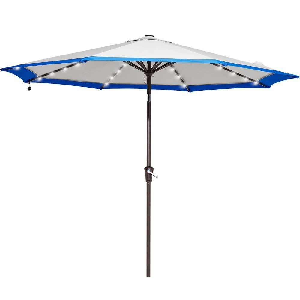 Get together with friends or families beneath this LED lighted outdoor patio umbrella. The 32-LED-lights on the canopy will brighten up your patio, while the crank lift system and manual tilt capabilities offer easy opening and adjustment, letting you effortlessly set up some shade. Plus, you can easily walk underneath the opened umbrella, as its lowest point rests 83 in. from the ground. The durable fabric 201g polyester canopy is dyed to be UV- and weather-resistant to prevent fading and last longer. It is ideal for garden, yard, cafe, coffee shop, beach and deck.