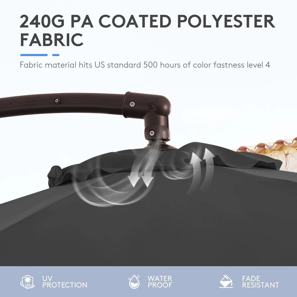 - Durable material- our offset hanging umbrella is made of 240gsm polyester fiber that is insulated, UV radiation resistant and water resistant, to extend the life of your new patio umbrella, we recommend that you cover and store your sunshade at night or in extreme weather conditions