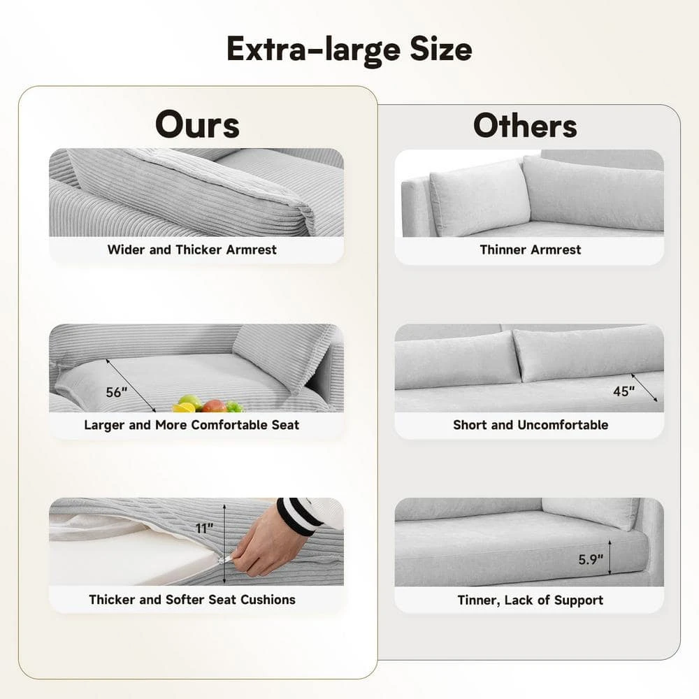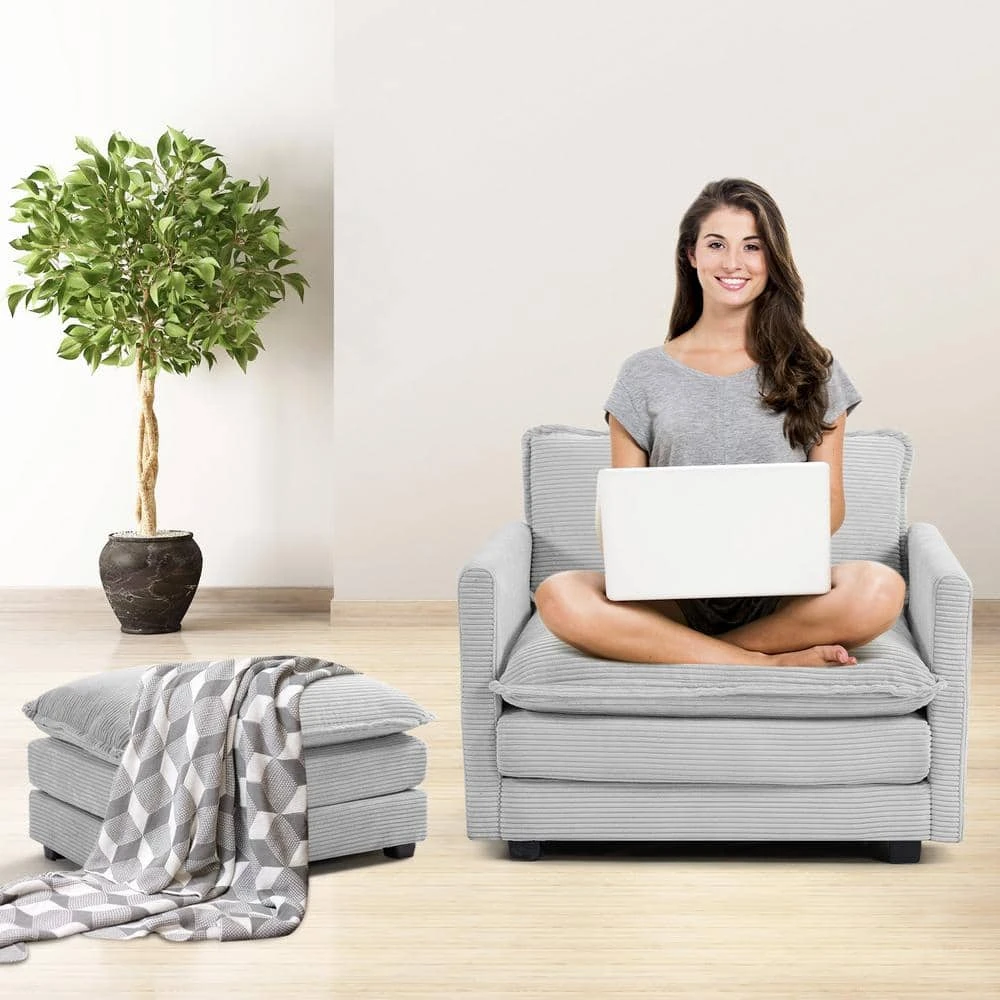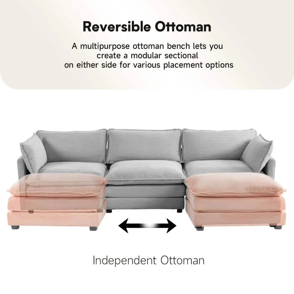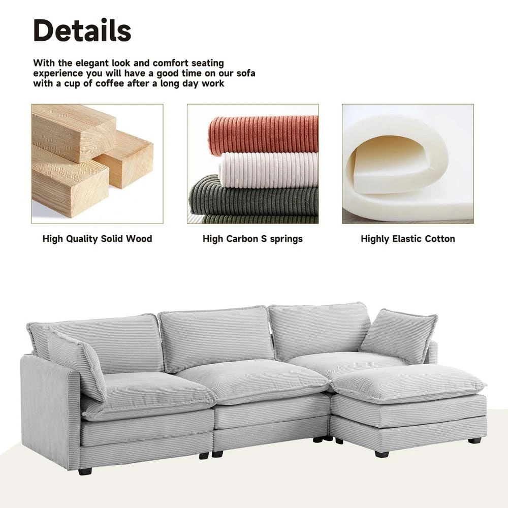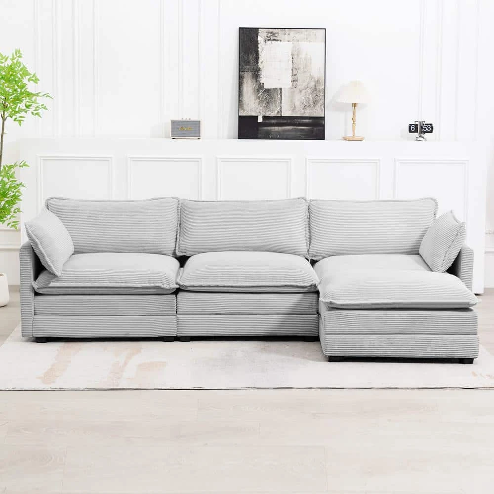 112 In. W 4-Piece Modern Straight Arm Corduroy Fabric L-Shaped Sectional Sofa With Ottoman In Gray
