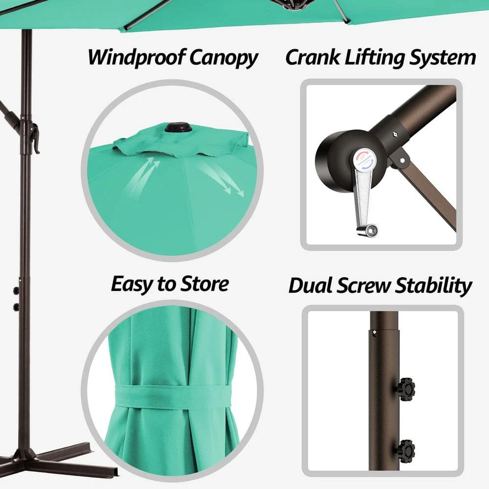 Enhance your outdoor experience with the 120 in. cantilever umbrella. Designed for both style and functionality, this umbrella provides ample shade while enhancing the aesthetic of your patio, garden, or poolside area. The smooth crank lift mechanism ensures effortless opening and closing, while the 120-inch (10-foot) canopy provides comprehensive shade for larger outdoor spaces. Enjoy comfort and style while protecting yourself and your guests from the sun with this exceptional cantilever umbrella. Available in 15 vibrant colors, this umbrella allows you to personalize your outdoor decor.