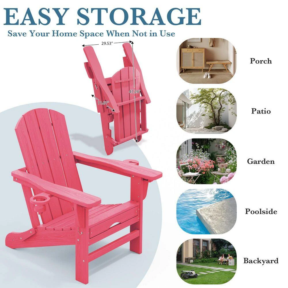 3-Level Adjustable Patio Folding Plastic Adirondack Chair With Retractable Ottoman, Cup And Phone Holders In Light Pink