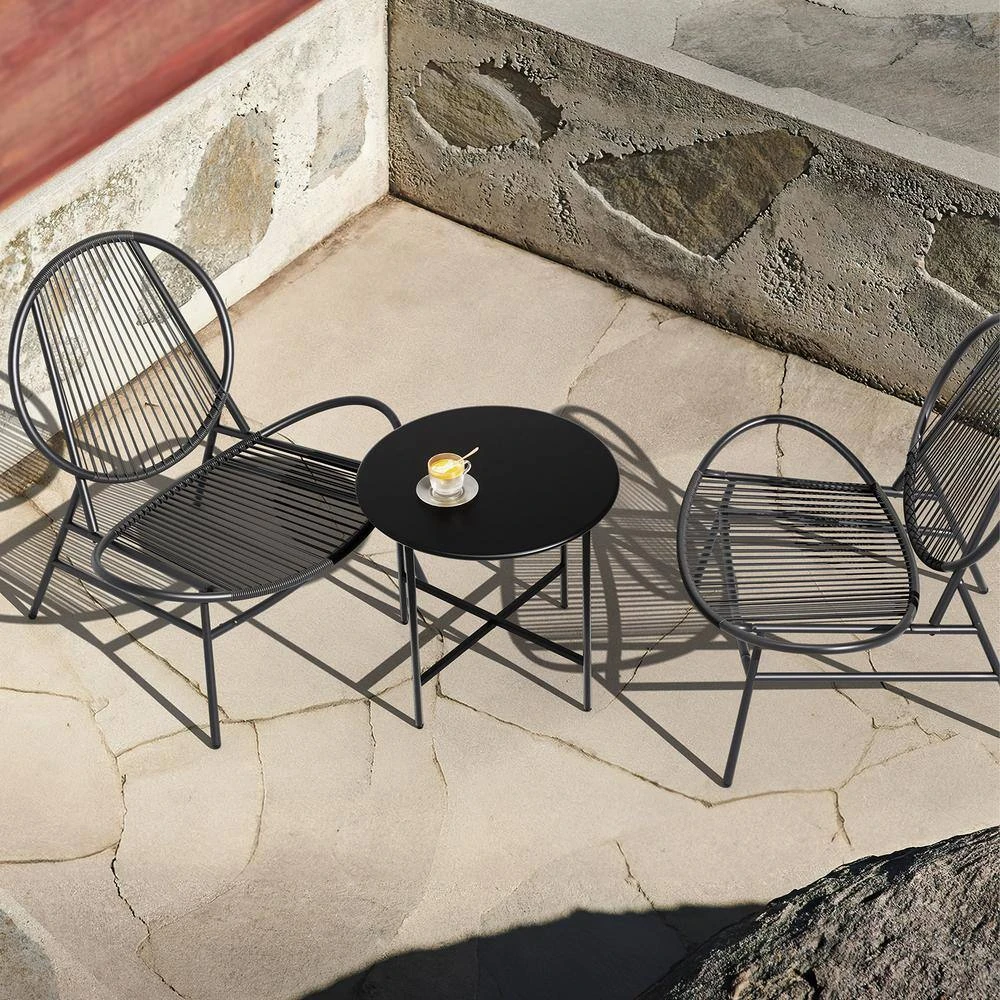 Simple yet elegant design makes this 3-piece bistro set perfect for any outdoor and indoor setting. You can sit on the front porch and enjoy afternoon tea or chat with friends in your own backyard. Made of cast aluminum, it features a unique design and black finish for a vintage look that will suit any home.