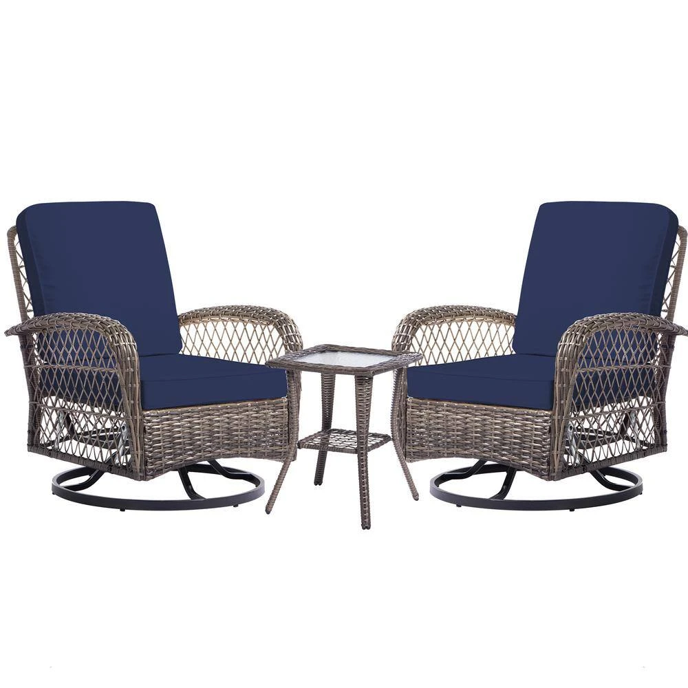 The outdoor swivel rocker set includes 2 wicker swivel rocker chairs and 1 tempered glass top side table. Each chair has a weight capacity of 265 lbs. and the side table has a weight capacity of 66 lbs. The natural color wicker with beige cushions in a simple and premium tone is perfect for decorating your patio, porch, deck, sunroom, and other outdoor spaces.