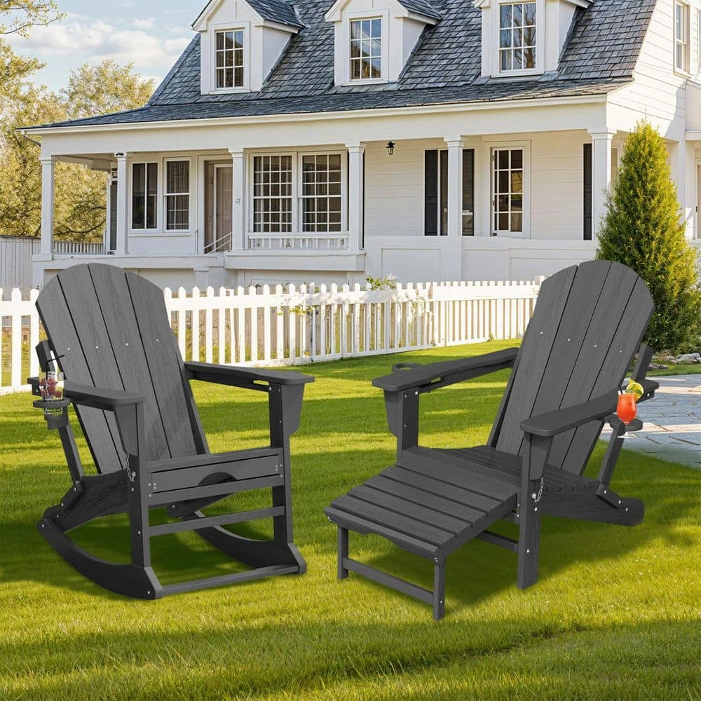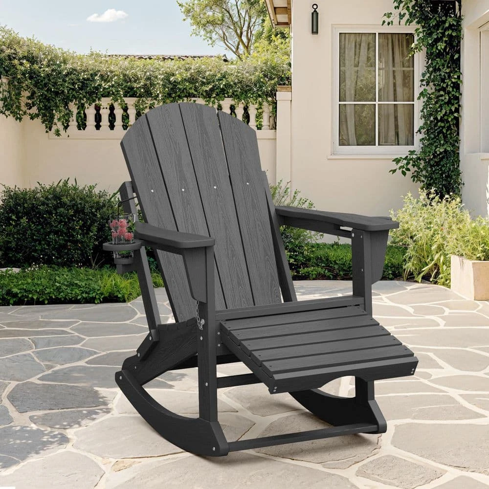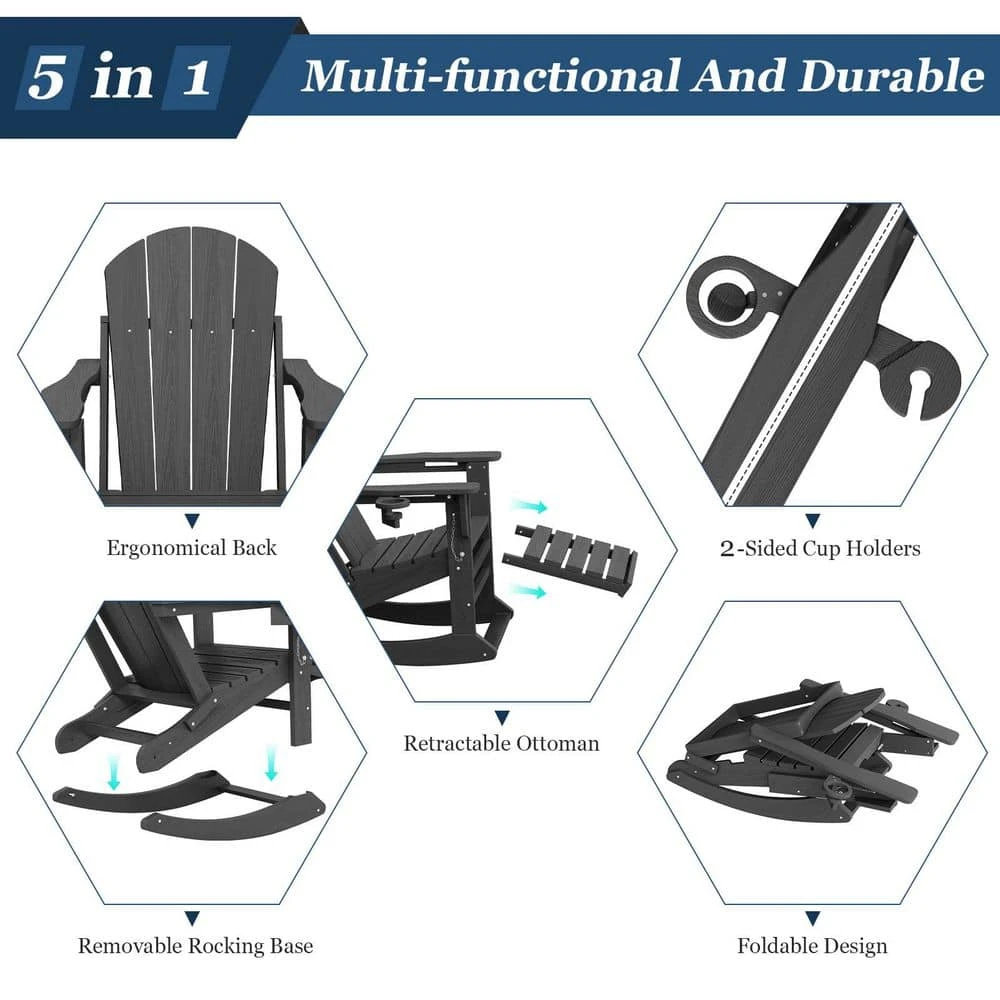 6-in-1 Multi-functional Gray Plastic Folding Rocing Adirondack Chair With Dual Cup Holders And Retractable Ottoman