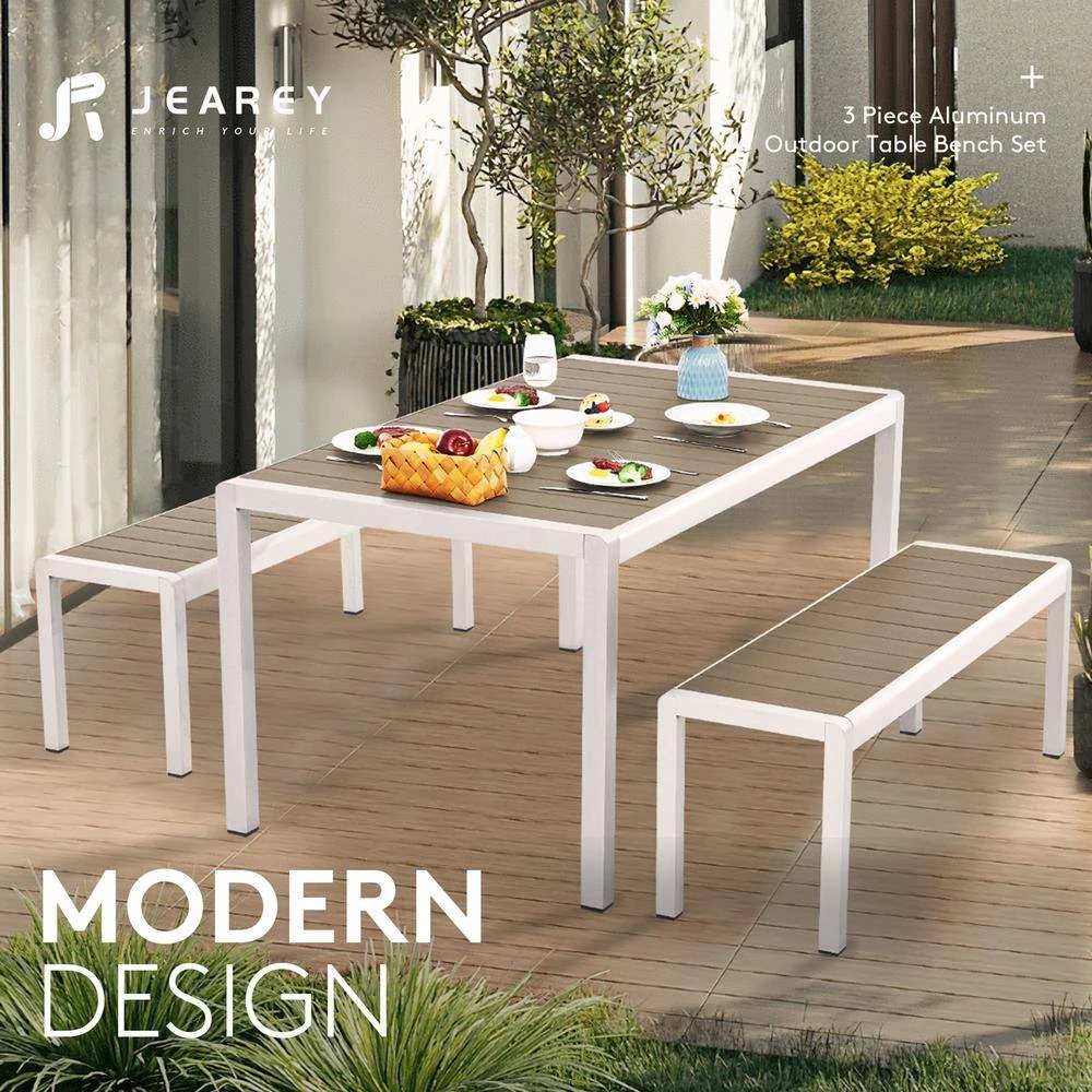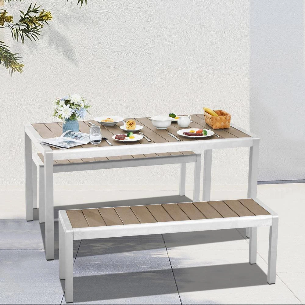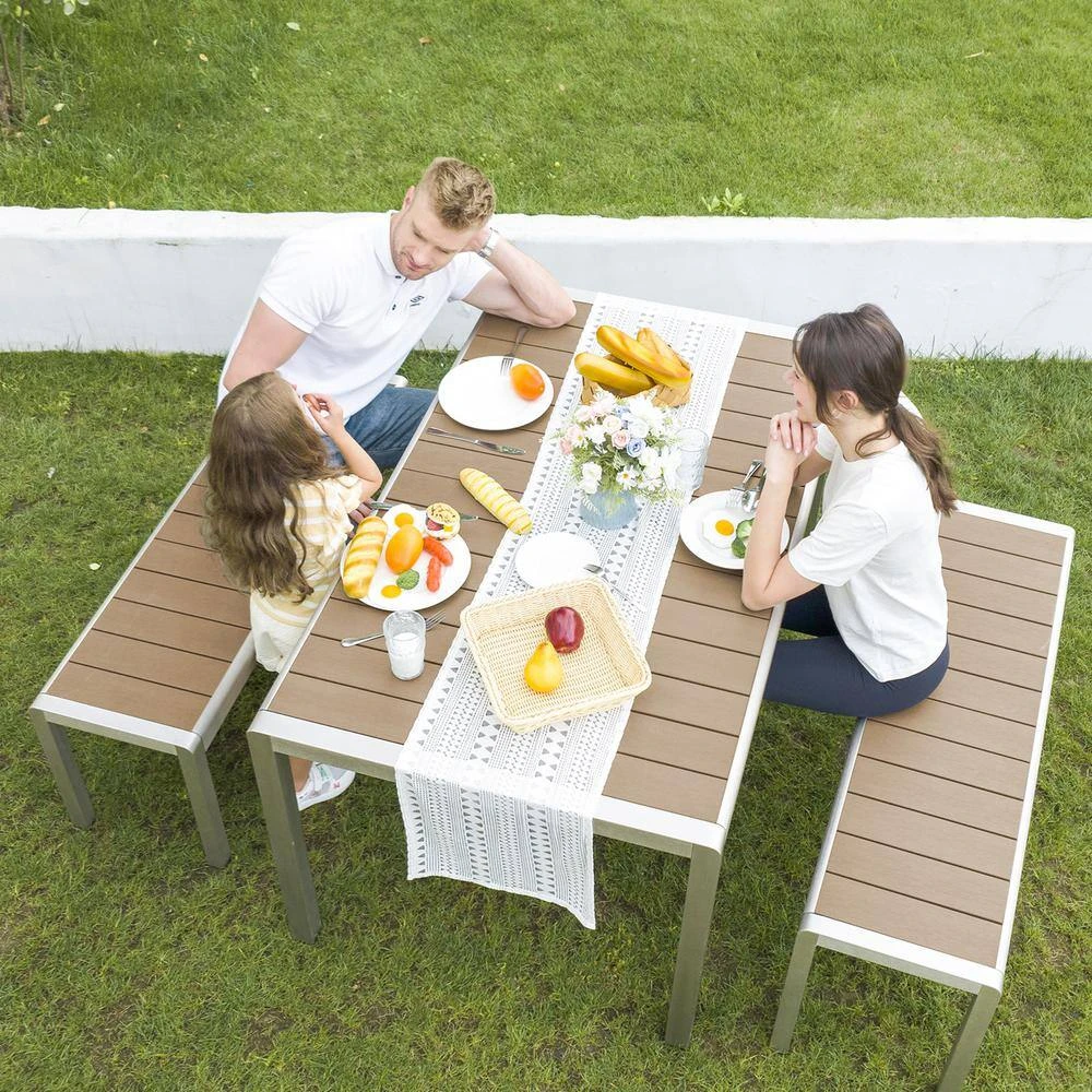 This dining table and bench set is perfect for anyone who wants to upgrade their dining experience. The table is made of high-quality aluminum and PS board, ensuring both durability and aesthetic appeal to prevent rust and corrosion. The aluminum tube has been treated with an oxidation process, giving it a sleek and modern look. Meanwhile, the tabletop features a single piece of PS board, which is not only easy to clean but also adds a touch of elegance to the whole set. The benches and the table creates a seamless and stylish look when placed together. Imagine having a nice family dinner on this elegant dining set, sharing delicious food and warm conversation with your loved ones. The sleek design adds a touch of modernity to your home decor. Whether you’re throwing a party or just having a casual dinner, this dining set will provide you with a comfortable and enjoyable experience.