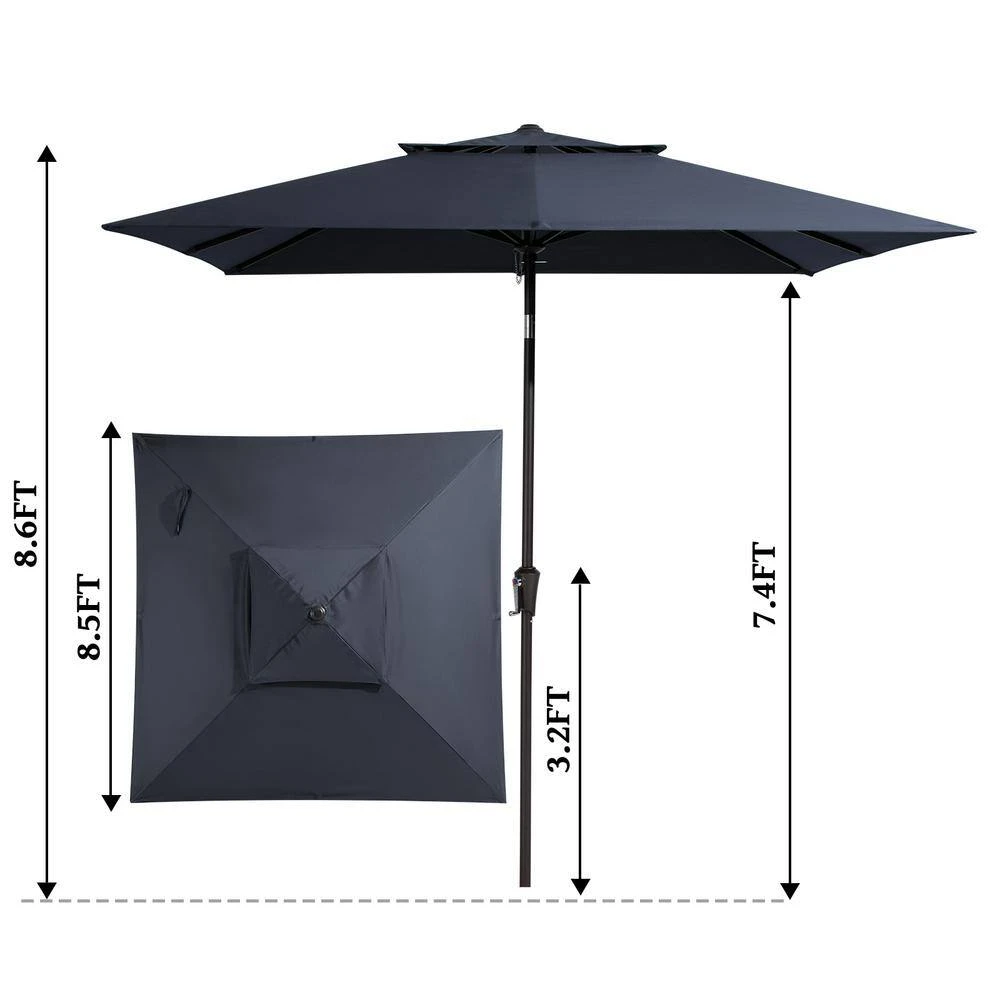 It is a great idea to add a parasol to your porch, garden, balcony, swimming pool, deck. Practical design with 2-tier vented top which is conducive to air circulation and reducing sultry. The 8.5 ft. x 8.5 ft. square market umbrella is better arranged. The tilt summary is not too high so that you can easily touch and use it. When you are not using it, you can easily close it with a strap. NOTE: The item is not contained base.