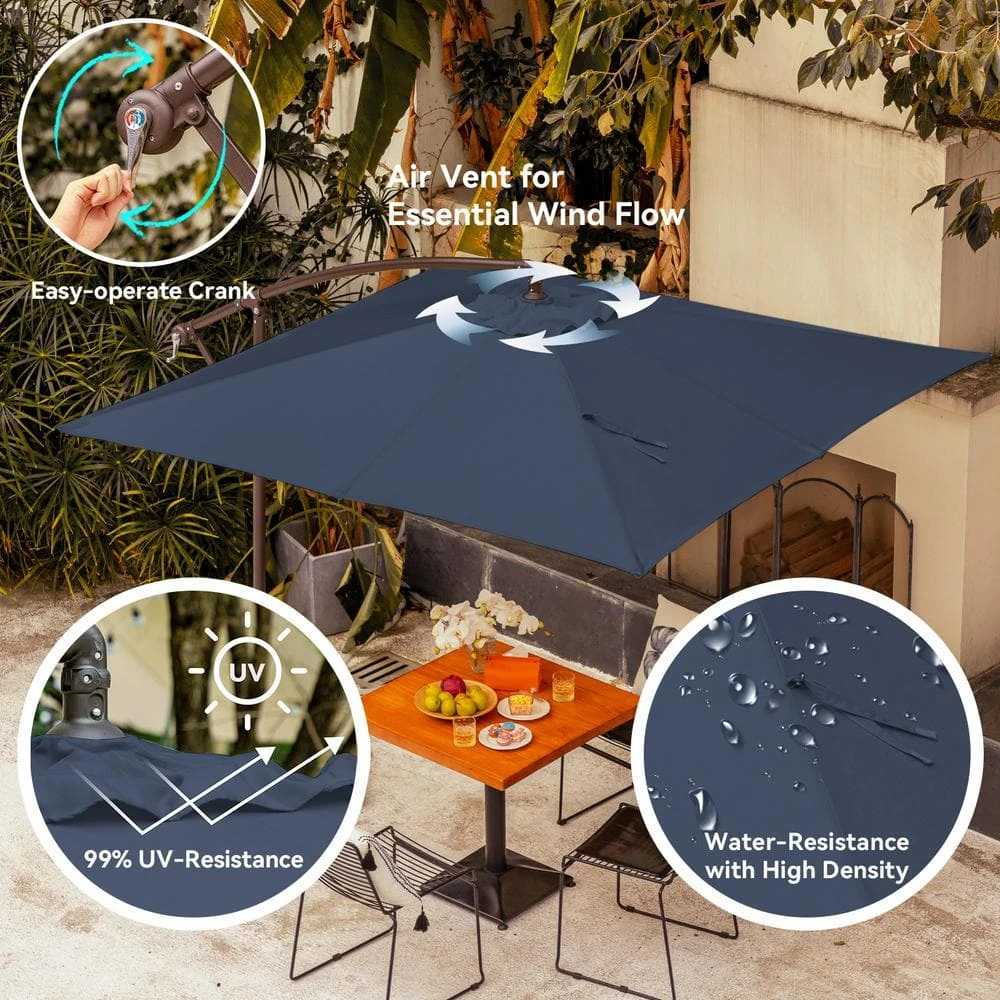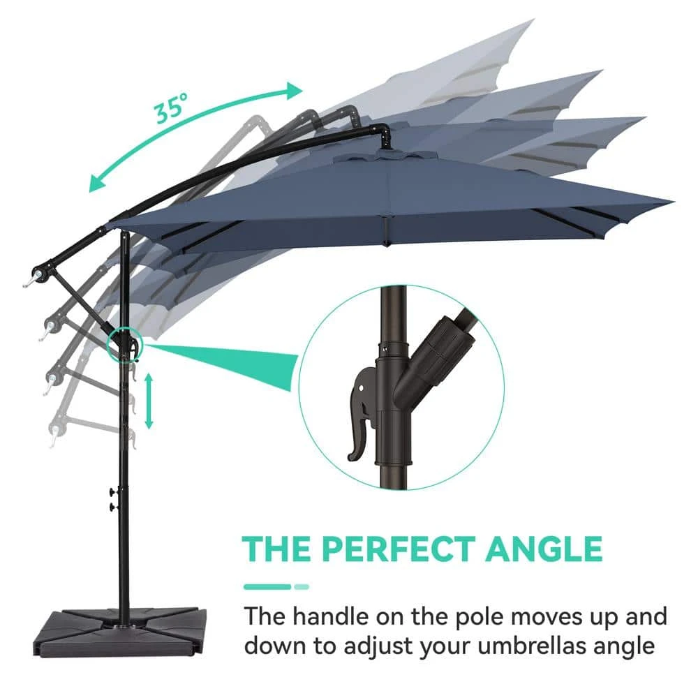 Get a new cantilever umbrella for your backyard or garden now. A wonderful solution for any leisure time outside under bright Sunshine. Even this umbrella can be used for commercial use, but outside of your store for those customers who want to sit outside the room. Please Note: Stand included, counterweight included as well (need to fill by yourself). Simple assembly, ship in 1 box.