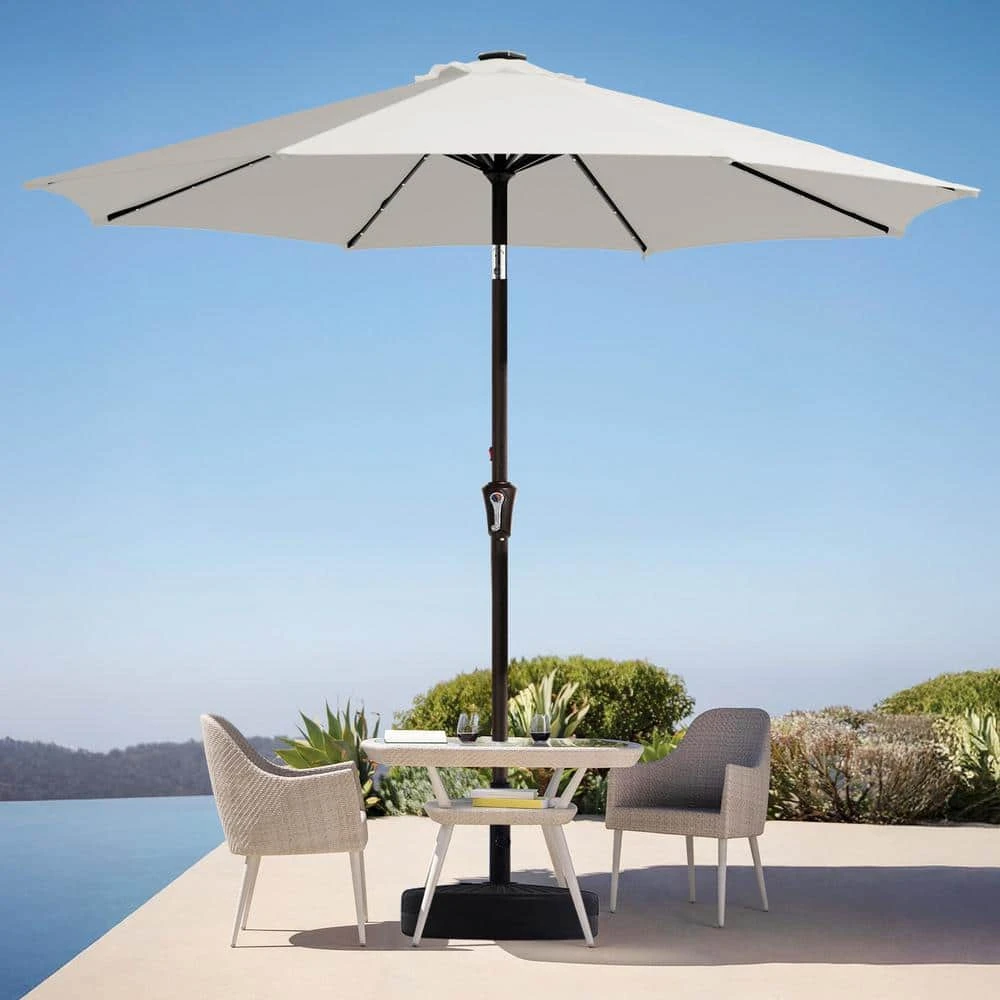 Enhance your outdoor living experience with the versatile and stylish Market Tilt Patio Umbrella. The umbrella features energy-efficient LED lights built into the ribs of the canopy, powered by a solar panel on top. The solar panel charges during the day to provide ambient lighting in the evening, allowing you to enjoy your outdoor space longer. This umbrella is designed to provide ample shade and comfort, making it a perfect addition to any patio, garden, deck, or poolside area.