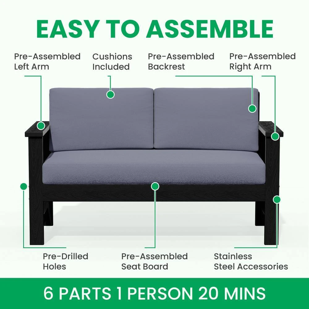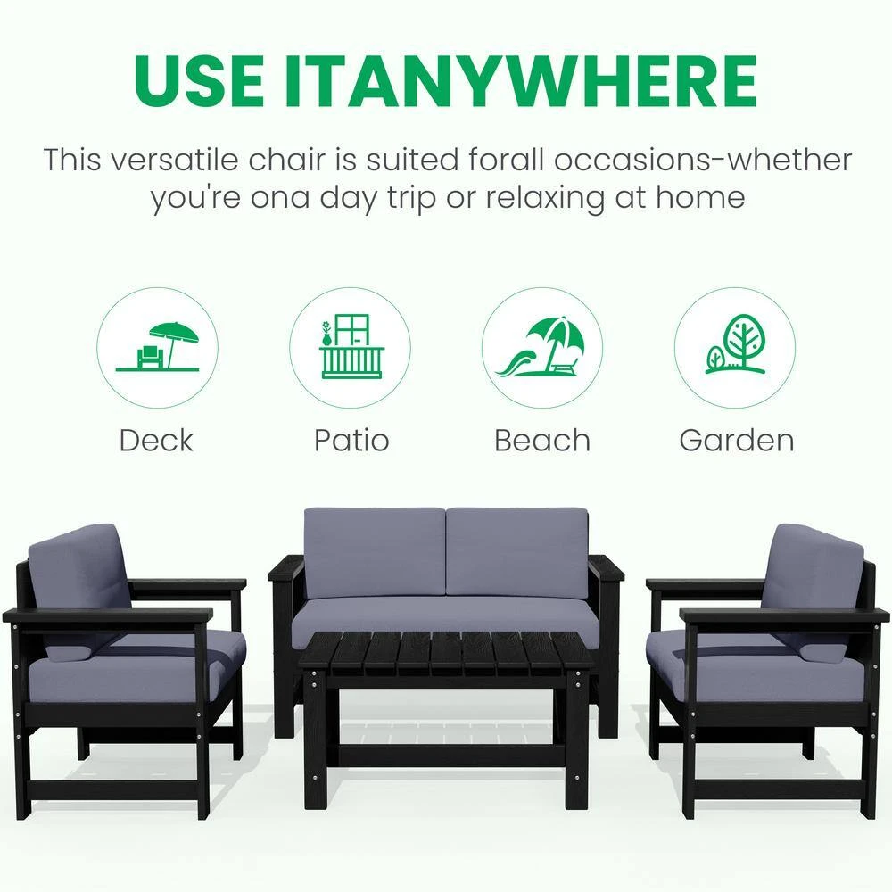Transform your outdoor space with the Conversation Set. It includes a loveseat, 2-accent chairs, and a convenient coffee table, all designed for comfort and durability. The HDPE construction ensures weather resistance, while the cushions offer ultimate relaxation. This set is also easy to assemble, perfect for your patio, garden, or balcony. Whether hosting guests or enjoying a quiet afternoon, our conversation set provides both elegance and functionality to elevate your outdoor experience.
