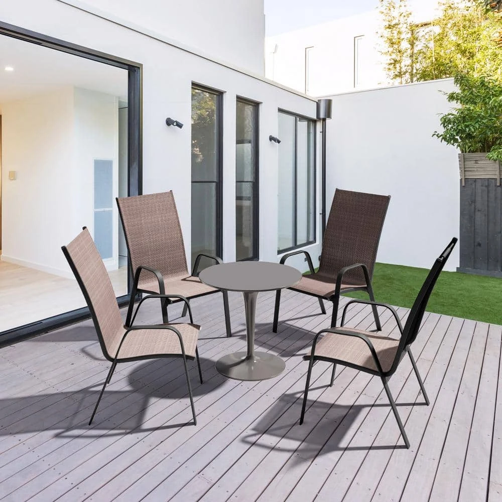 These patio chairs are made of maximum flexibility for you to relax and enjoy the outdoor time with family and friends. The selected fabric is breathable, quick-drying, wear-resistant and durable, which will withstand outdoor conditions better. And the frame is made of sturdy and rustproof steel for strong loading capacity. These patio dining chairs can be stacked in a vertical shape that is designed for space-saving. And easy to move here to there since lightweight design. With incline and high back and curved armrests, this outdoor dining chairs support your body well and relax your arms. And seat area is wide enough for most people. The height from the ground to seat is 16.93 in., so these patio chairs match most outdoor dining table (not included) perfectly. Enhance your dream garden with this comfortable dining set. Note: Please do not tighten all the screws until all the holes are aligned.