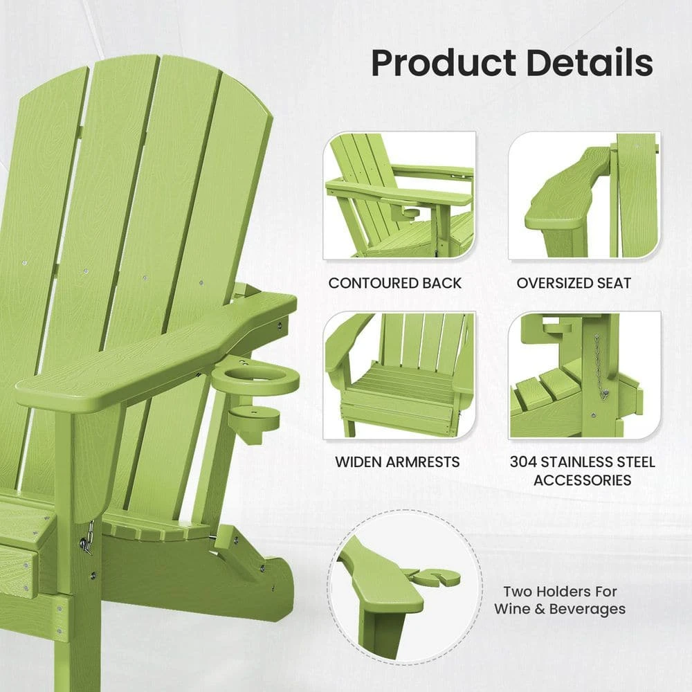 Classic Apple Green Folding HDPE Adirondack Chairs With 2-Cup Holders-Weather Resistant Patio Outdoor Chair (Set Of 1)