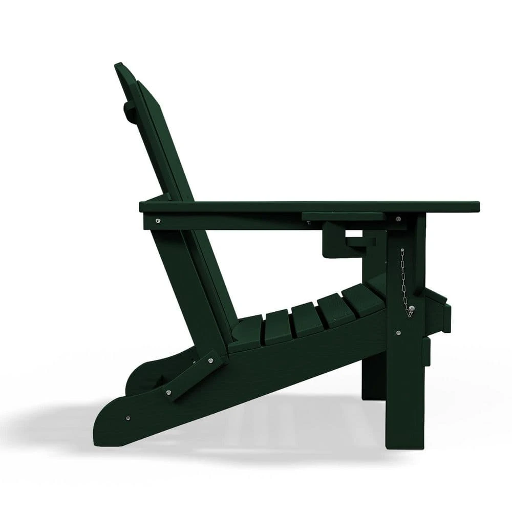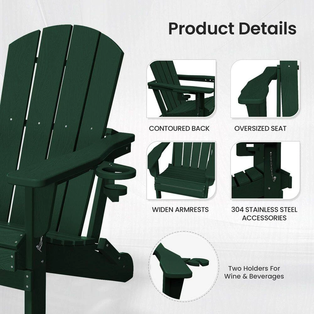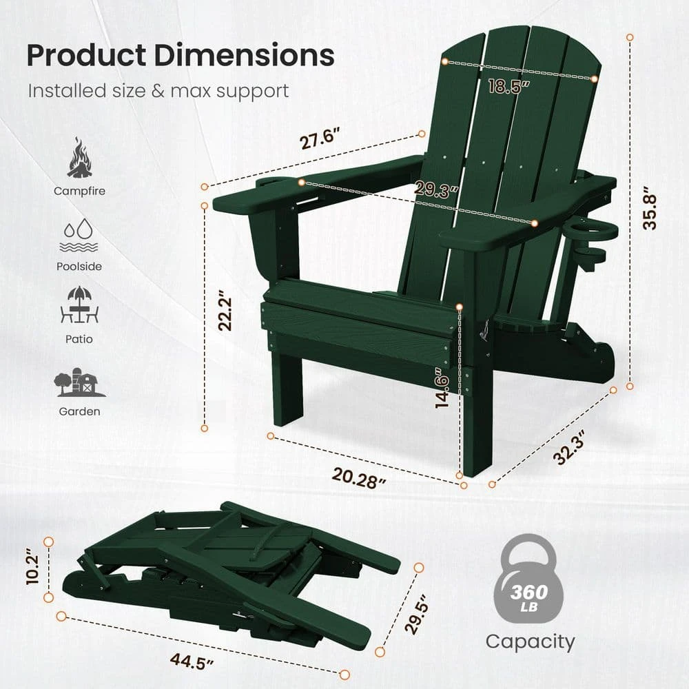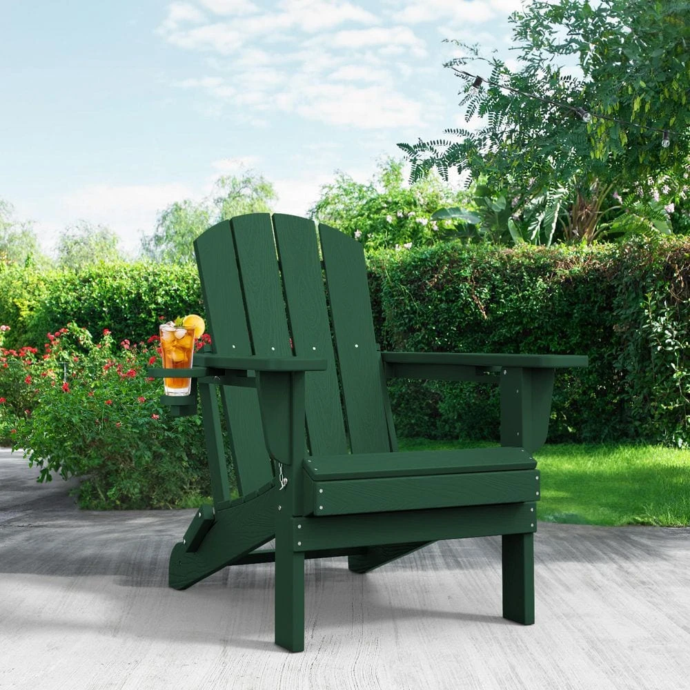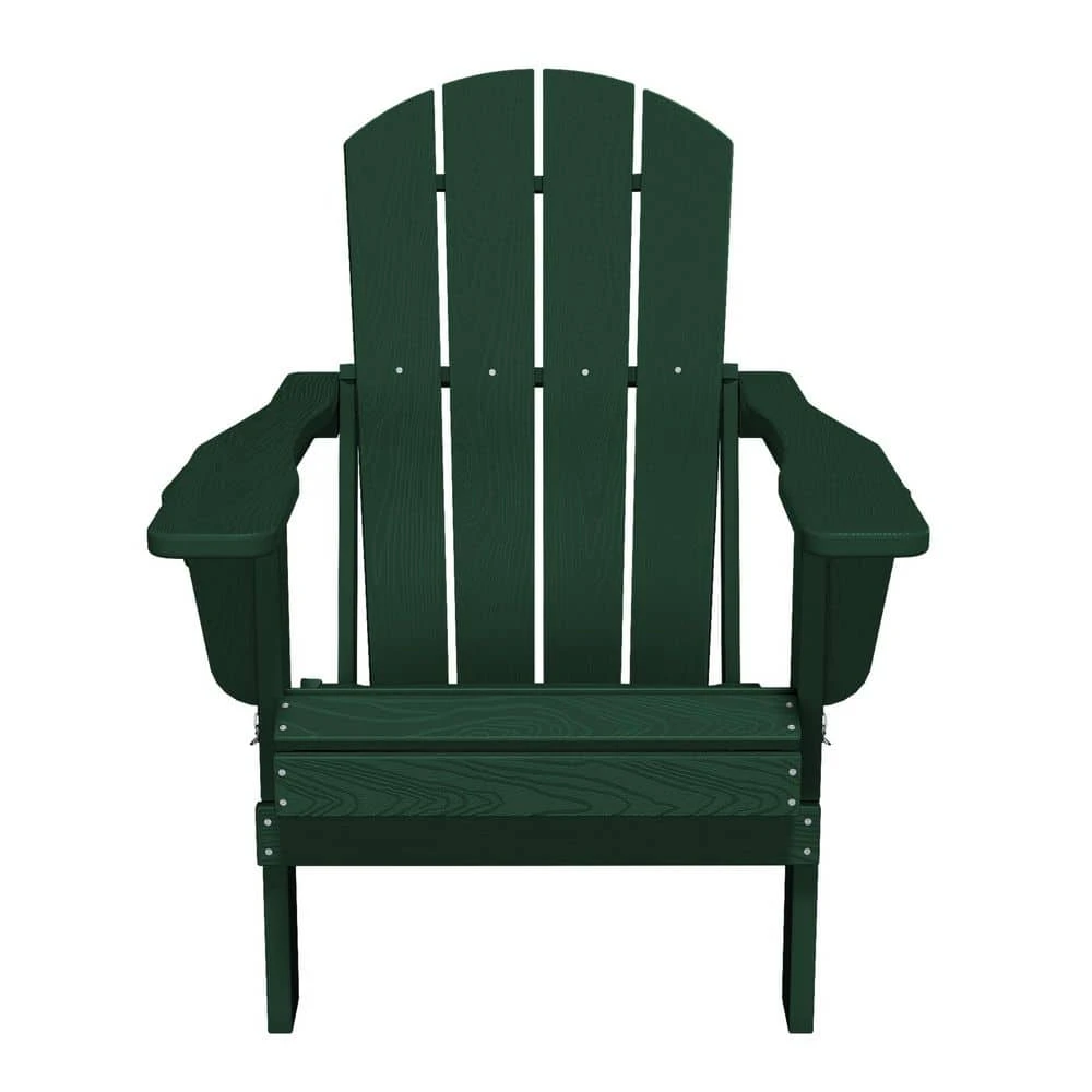 Classic Dark Green Folding Plastic Adirondack Chairs With 2-Cup Holders-Weather Resistant Patio Outdoor Chair (Set Of 1)