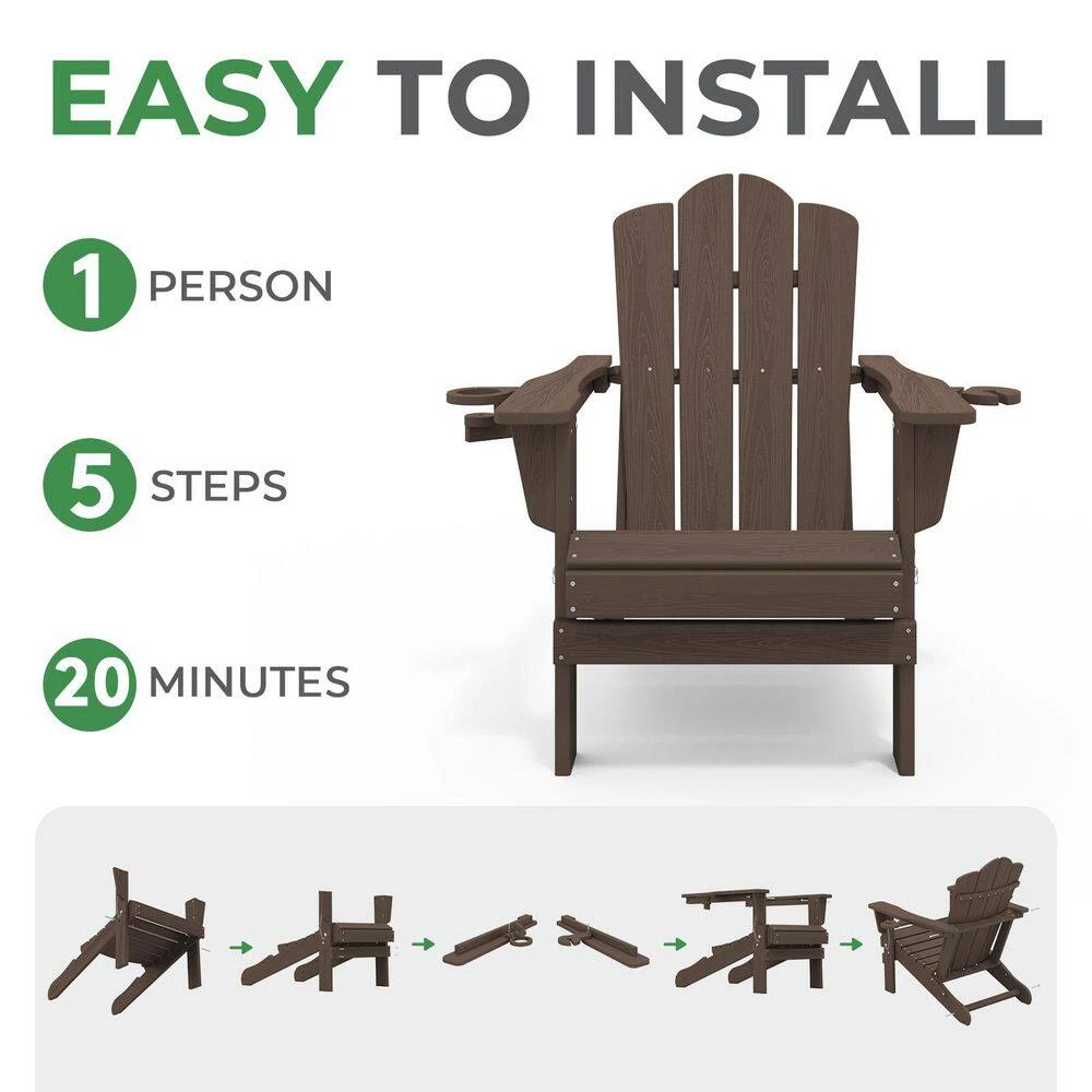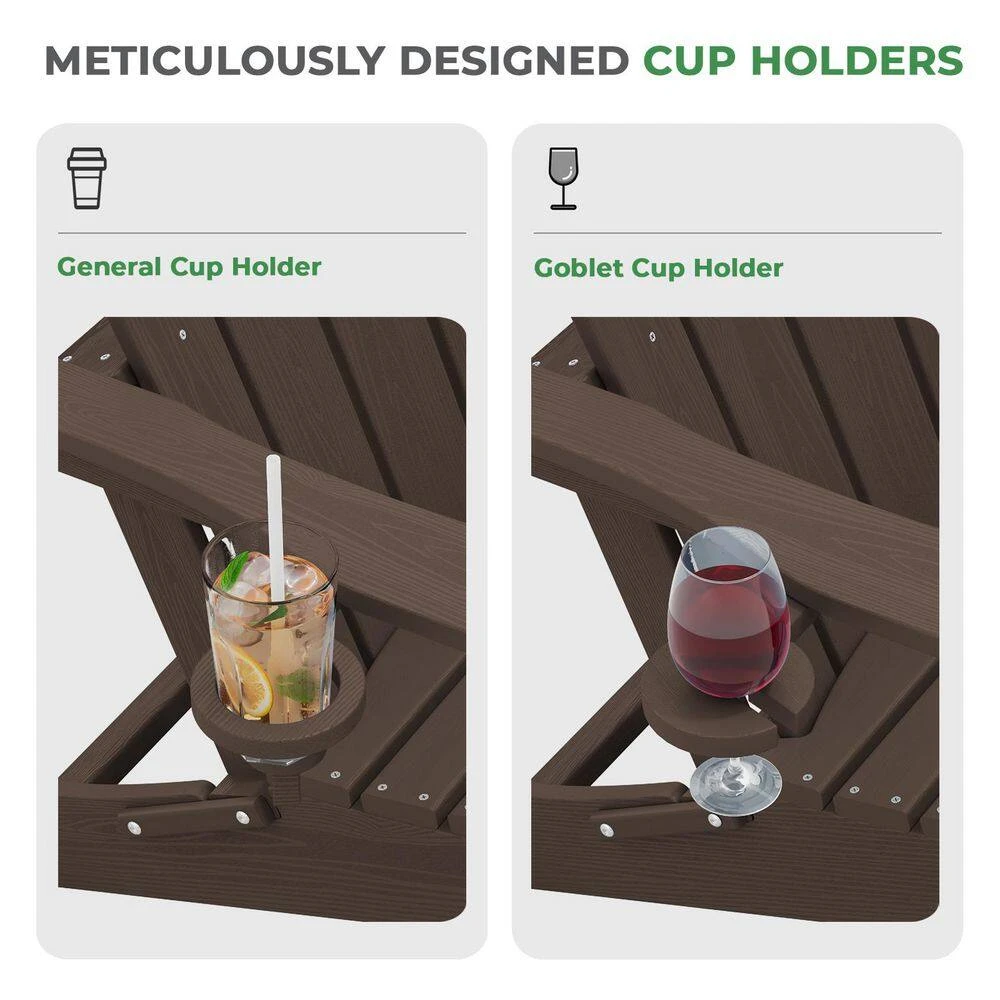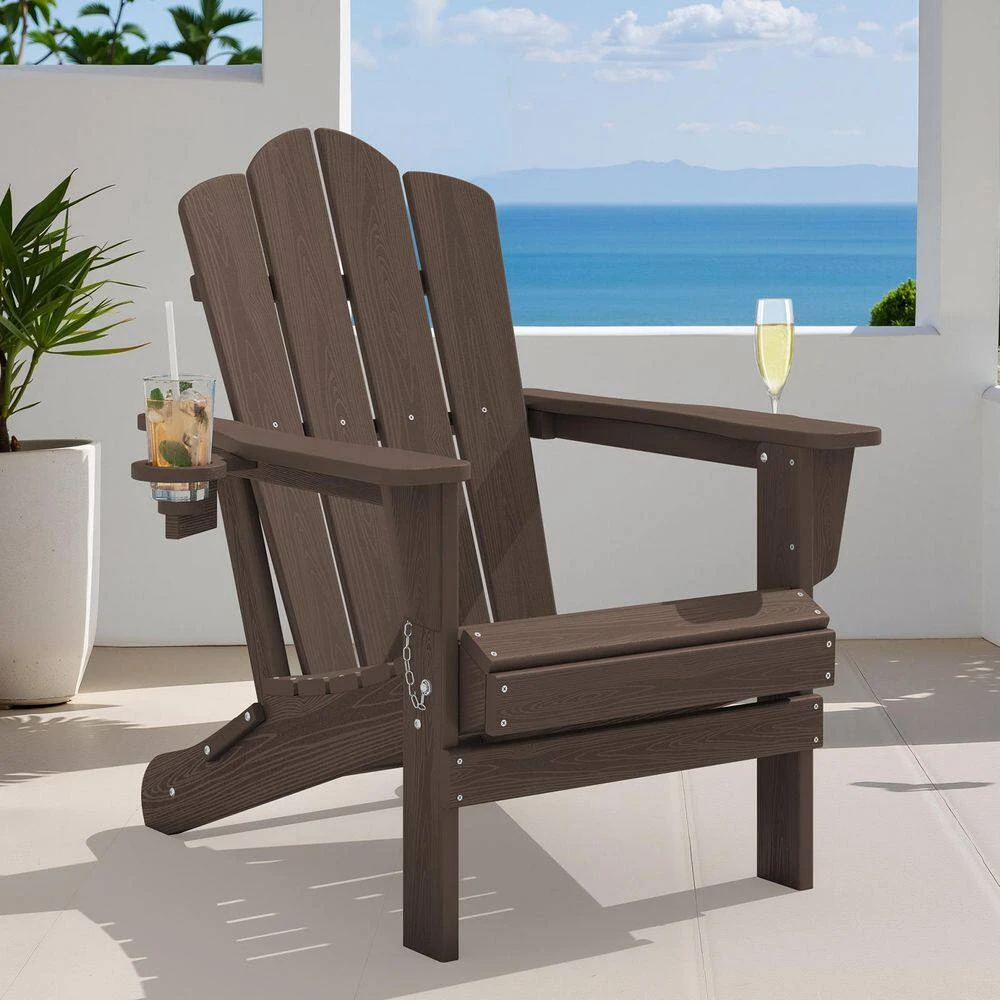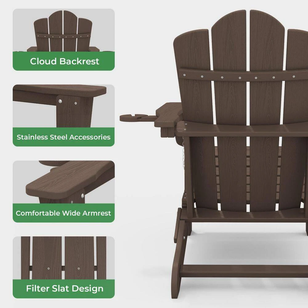 Classic Outdoor HDPE Folding Plastic Adirondack Chair With 2 Cup Holders In Coffee (Set Of 1)