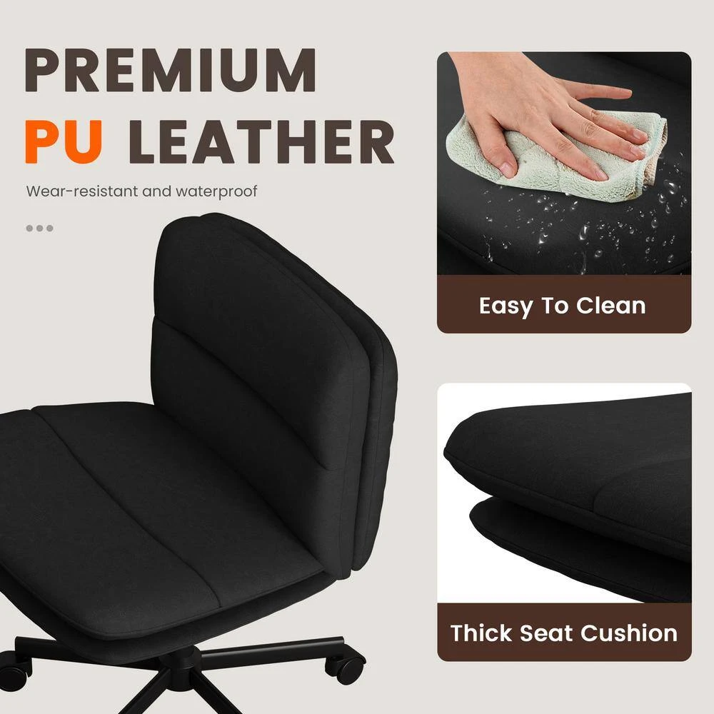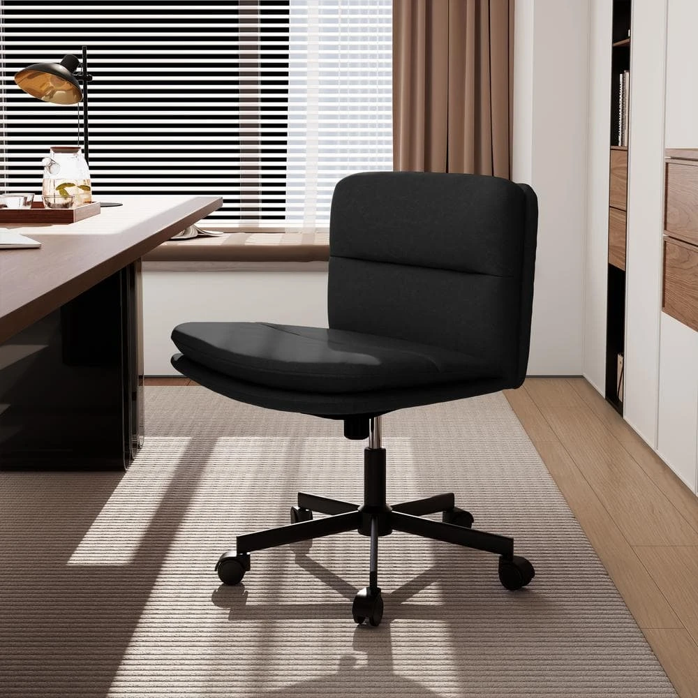 Whether you’re decorating a home office or an office conference room, this modern office chair, ergonomic swivel upholstered chair is the perfect choice. It features a comfortable backrest that provides lumbar support. A generously sized seat provides additional support. The chair is upholstered in polyurethane and padded with foam to provide just the right amount of cushioning. The sophisticated tufted back and seat create a tailored aesthetic. The star-shaped base has 5 curved legs with casters that allow you to roll it throughout your space. Plus, you can change the height of the seat and swivel it 360°.