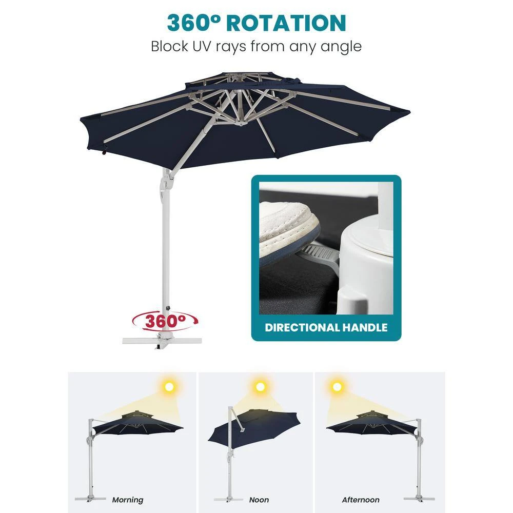 - Diameter of this patio umbrella is 11 ft., unique double-top canopy design for commercial and residential use, this cantilever umbrella has unique handle design and crank system, 6 height and angle to choose, 361° rotation for easier shading area control