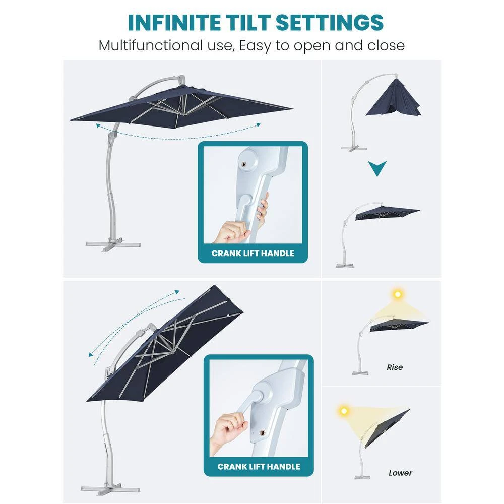 - Crank and tilt system design – this patio cantilever umbrellas is easy to opening and closing with it’s crank and tilt system convenient slide and lock operation system offers multiple angles of shading that helps you keep the Sun out from many angles and creates cool and comfortable environment for your family