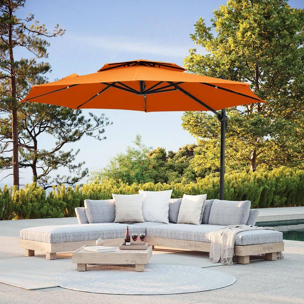 Relax outside day or night with our durable and chic 11 ft. cantilever patio umbrella. While the weather-resistant canopy protects you from the sun’s heat and harmful rays. Our umbrella can provide shade for a round or rectangle table with up to 9 chairs. You can use it in residential and commercial locations, e.g. gardens, yards, pool, deck, background beach, balcony, restaurant, and other outdoor areas.