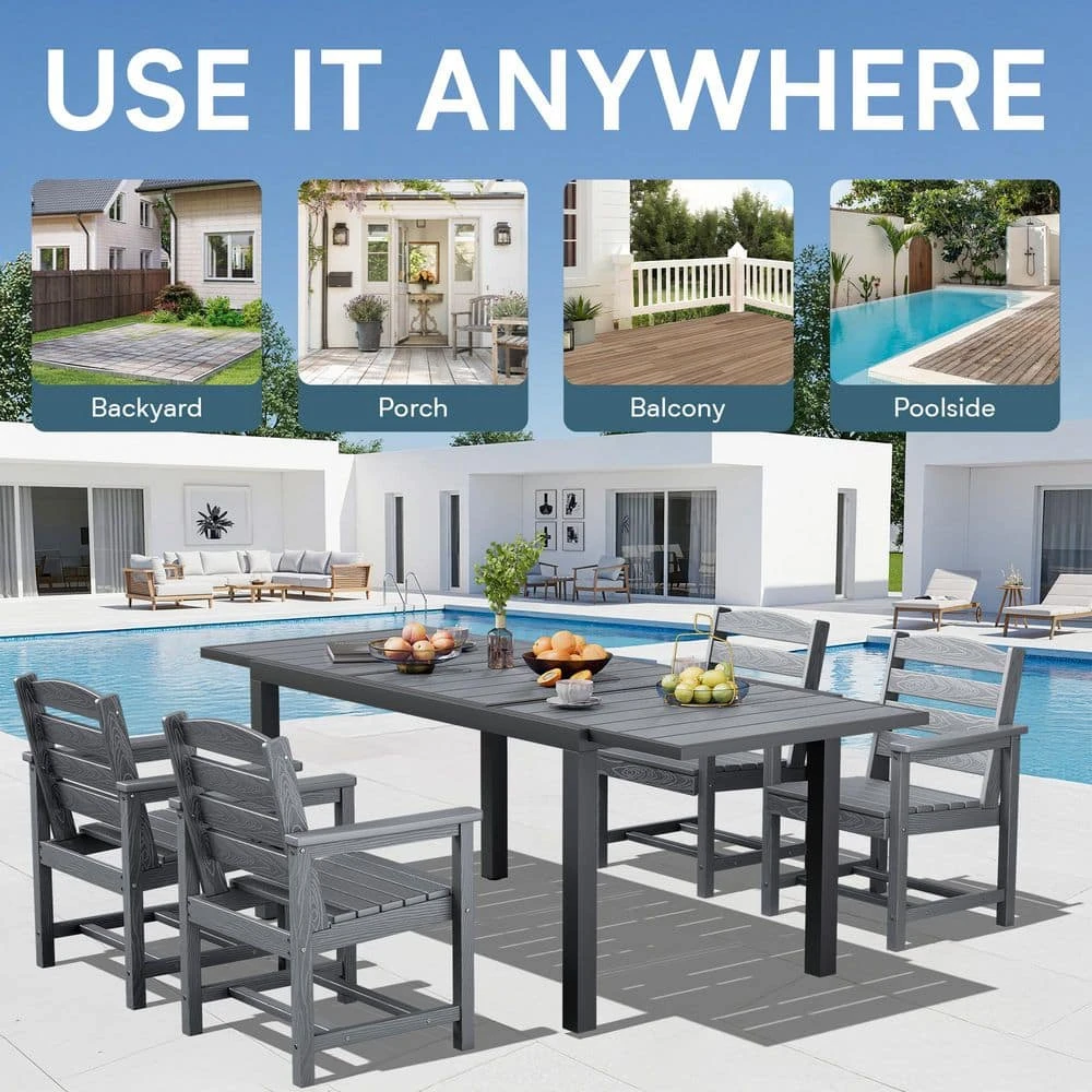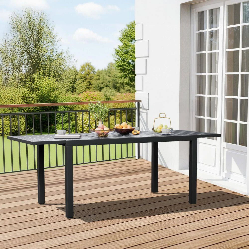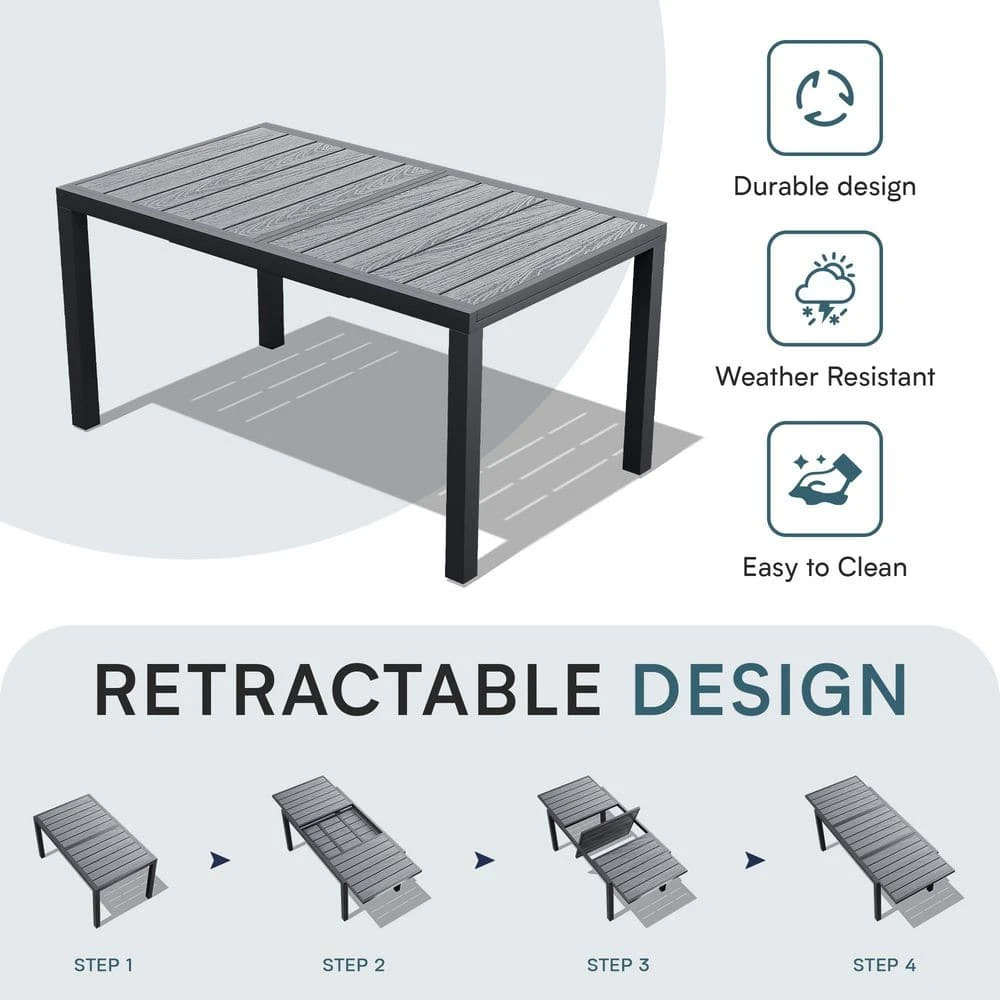 Our extension-ready dining table is designed to make hosting a breeze. This product has been crafted with weather-resistant HDPE, making it easy to clean and ensuring the color remains vibrant and lasting. It features a sturdy, rust-proof aluminum frame at standard dining height. The extendable design offers ample seating for additional guests. Ideal for gatherings, this table combining low-maintenance durability with contemporary style for your patio or garden.