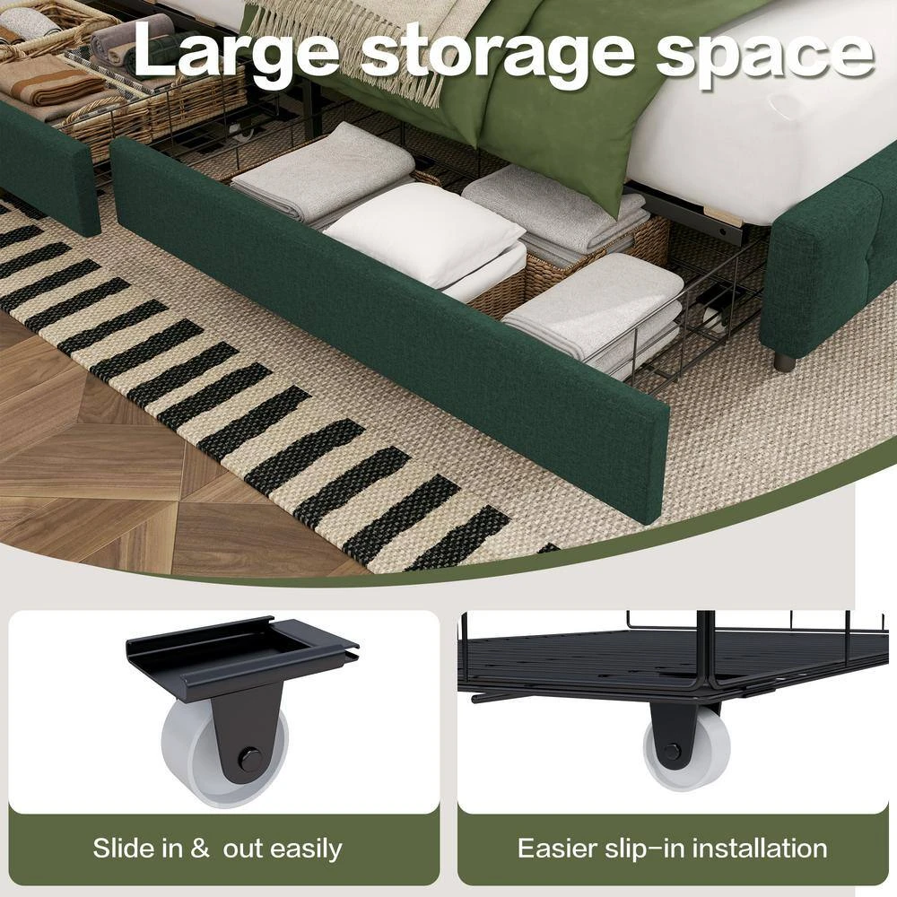 - Convenient storage solution: Say goodbye to clutter and hello to a tidy bedroom. Our queen storage bed frame comes with four spacious under-bed storage drawers on wheels. Ideal for organising out-of-season clothes, quilts and smaller items, these drawers ensure your belongings are neatly stored away. We also supply 4 matching drawer liners to prevent tipping and keep everything in place to protect your belongings.