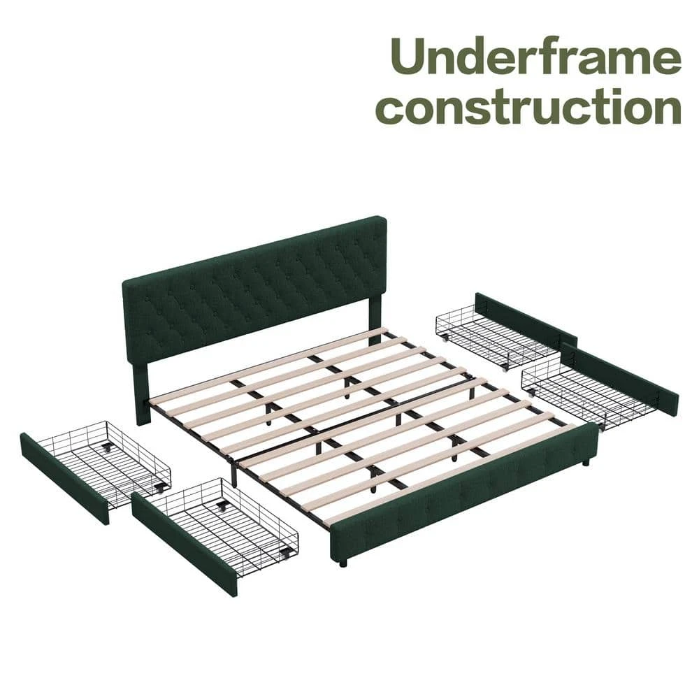 - Convenient storage solution: Say goodbye to clutter and hello to a tidy bedroom. Our queen storage bed frame comes with four spacious under-bed storage drawers on wheels. Ideal for organising out-of-season clothes, quilts and smaller items, these drawers ensure your belongings are neatly stored away. We also supply 4 matching drawer liners to prevent tipping and keep everything in place to protect your belongings.