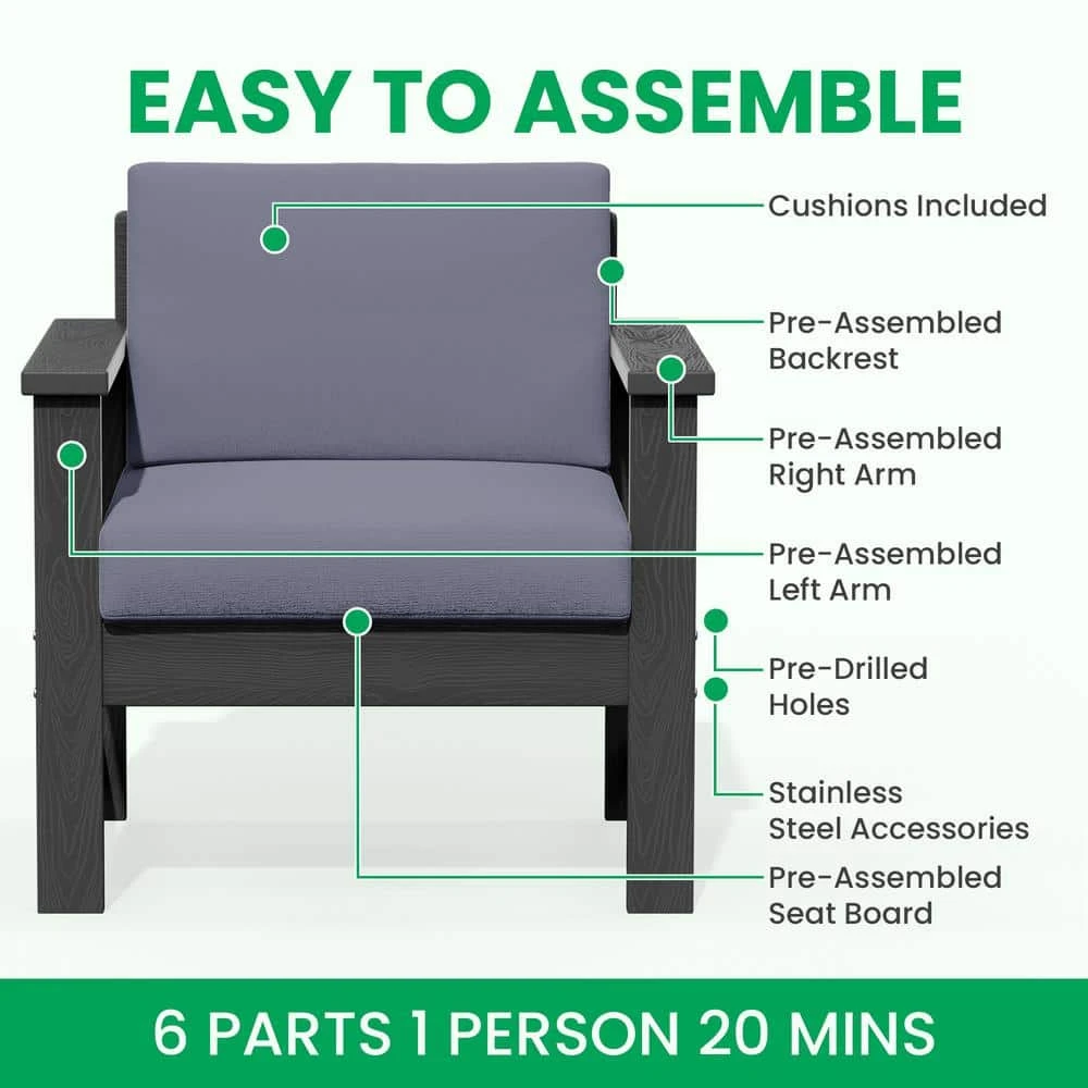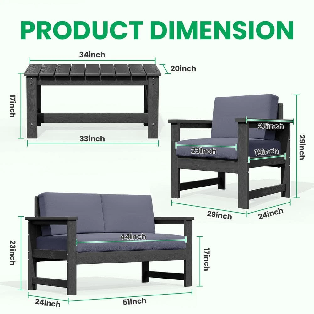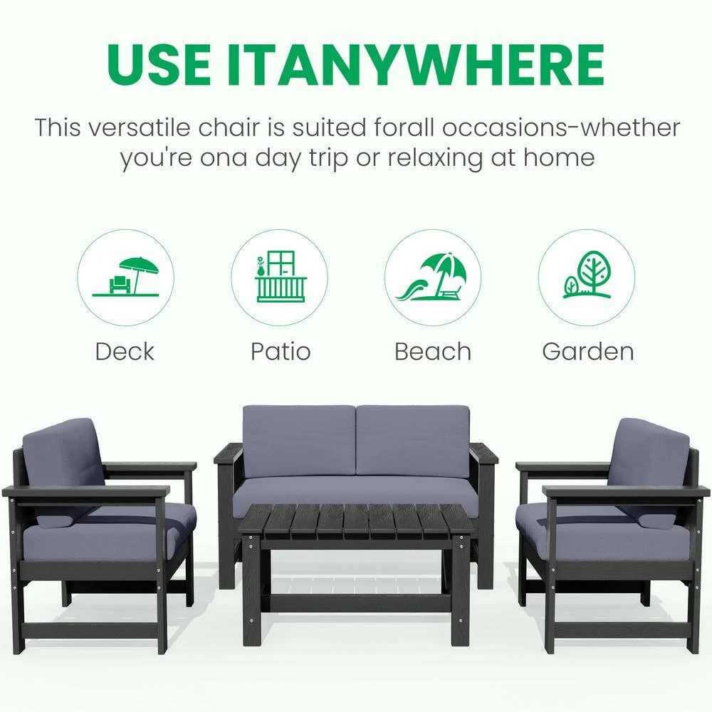 Transform your outdoor space with the Conversation Set. It includes a loveseat, 2-accent chairs, and a convenient coffee table, all designed for comfort and durability. The HDPE construction ensures weather resistance, while the cushions offer ultimate relaxation. This set is also easy to assemble, perfect for your patio, garden, or balcony. Whether hosting guests or enjoying a quiet afternoon, our conversation set provides both elegance and functionality to elevate your outdoor experience.
