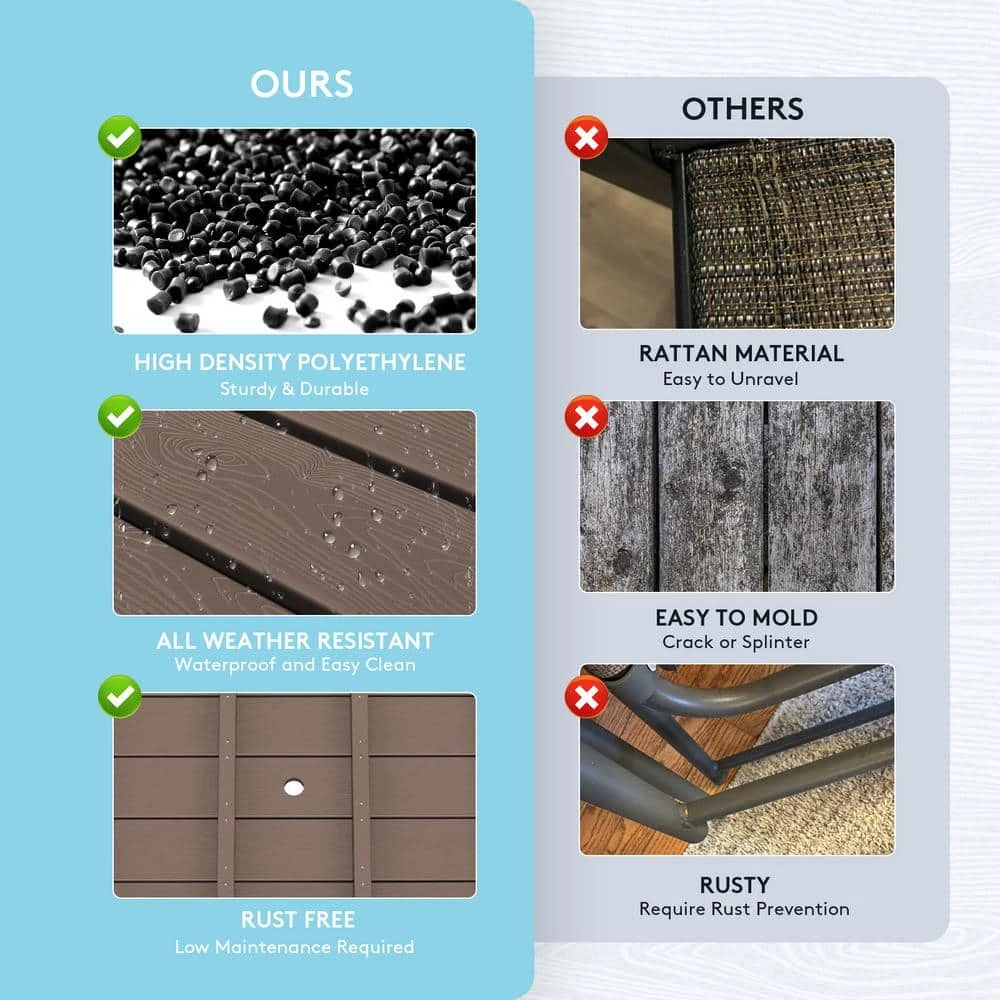 - Unmatched durability: constructed from high-density polyethylene (HDPE), our dining set is engineered to withstand the rigors of outdoor living say goodbye to rust, corrosion, and maintenance headaches, and hello to years of worry-free enjoyment