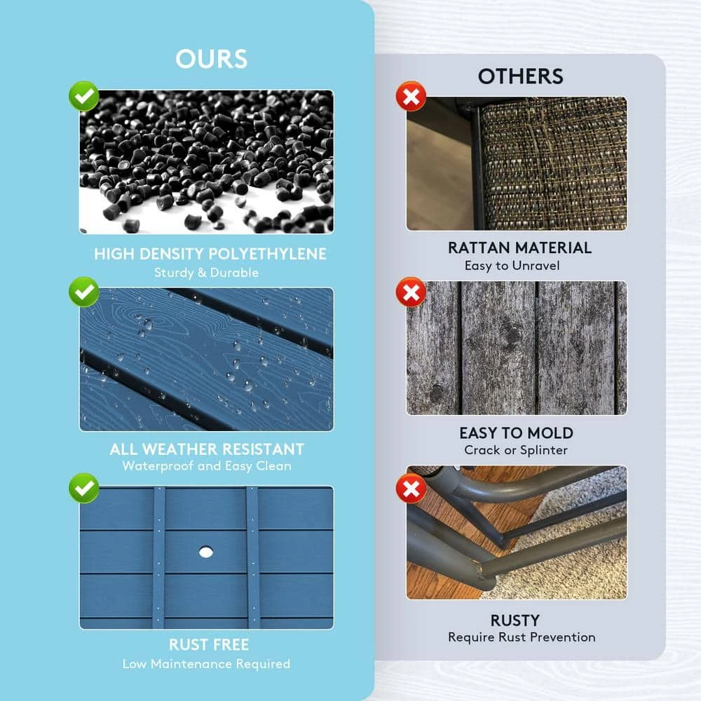 - Weather-resistant and fade-free: designed to brave the elements, our HDPE dining set is uv-resistant and fade-proof, retaining its vibrant color and beauty season after season rain or shine, your outdoor oasis remains inviting and picture-perfect