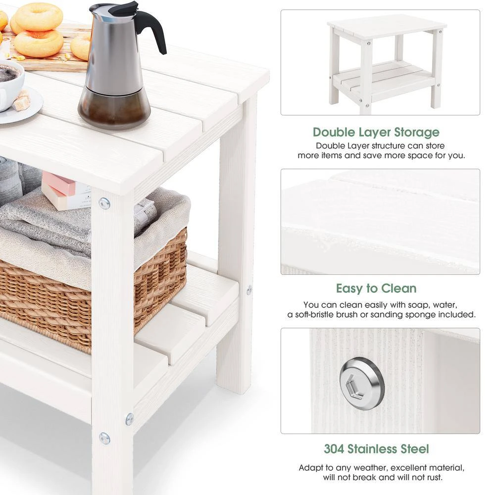 The perfect end table for your patio or living room. Featuring a 2-shelf design and great weight capacity. The weight capacity of the top shelf is 360 lbs. and the weight capacity of the bottom shelf is 160 lbs. How surprising. It is equivalent to a small seat. You can stack some books or magazines on the bottom shelf.