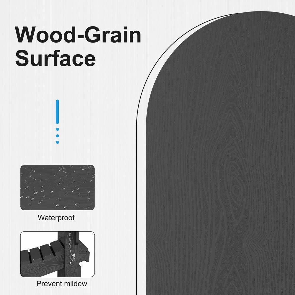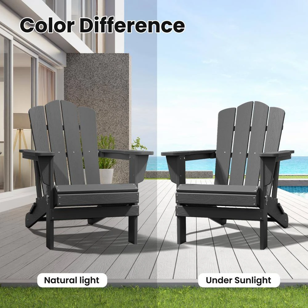 This product adopts improved resin material, new HIPS plastic, both with wood texture and plastic durability, more beautiful outlooking than the general high-density polypropylene material on the market. It shows good performance on waterproof, all weather-resistant, easy to clean, and could leave outside for years without cracking or peeling. More importantly, its foldable feature allows you to provide great help when you are not using it or when you go out to carry it. The ergonomic design features wide arms, a curved seat, and high back support, you can fully relax in it, or enjoy a pleasant time with your family and friends. No matter in your garden, backyard, or patio, the chairs all fit well with other furniture. And it is also the perfect partner for the firepit as the outdoor seat sets. All contents are packed in 1 box. Light assembly required. Please search the side table to match this adirondack chair by 321043534.