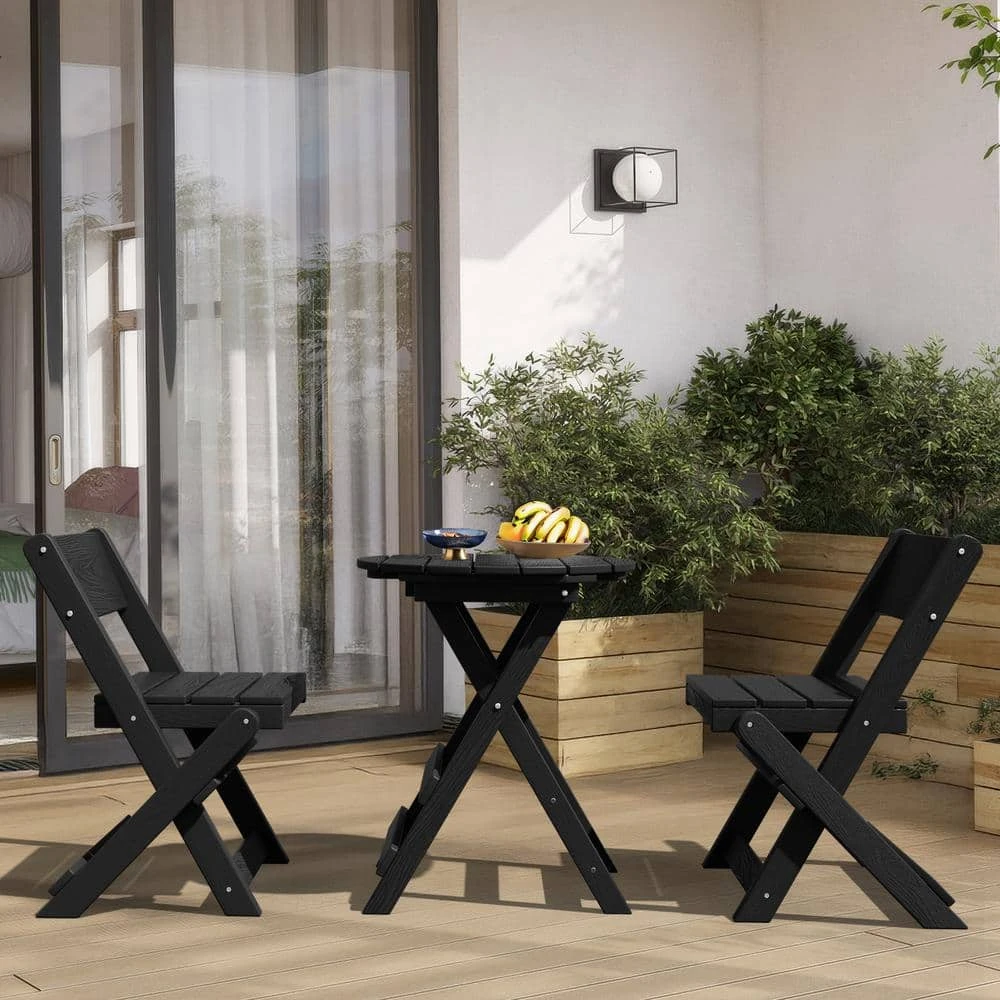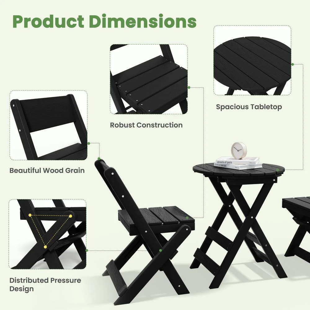 Crafted from durable, weather-resistant HDPE, our outdoor bistro set features a modern design that’s perfect for relax in patios, balconies, or gardens. Lightweight yet sturdy, it’s easy to set up and fold for storage. Enjoy meals al fresco with its comfortable seating and sturdy table, all while saving space. Elevate your outdoor lifestyle – order now and bring a touch of elegance to your backyard.