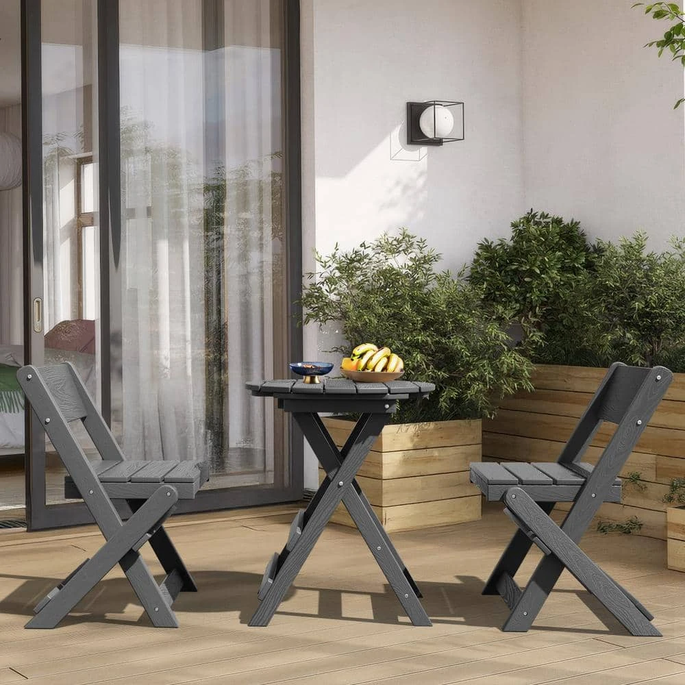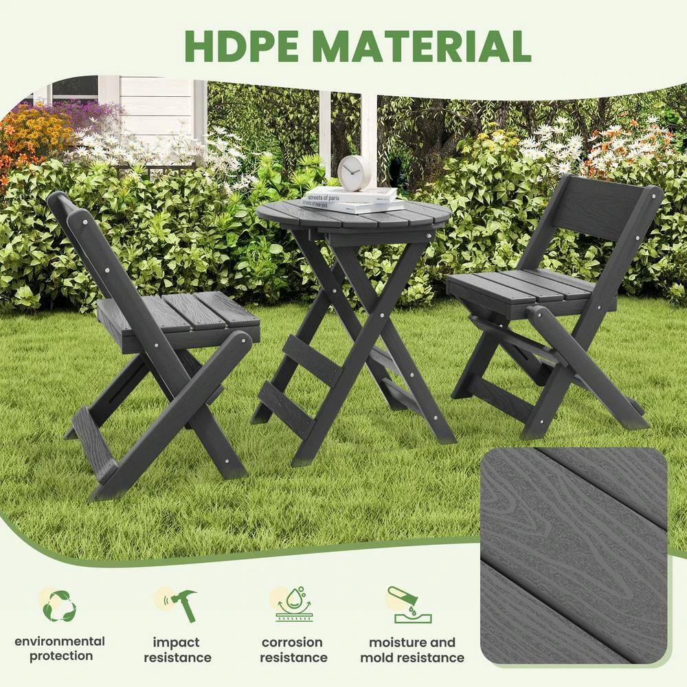 Crafted from durable, weather-resistant HDPE, our outdoor bistro set features a modern design that’s perfect for relax in patios, balconies, or gardens. Lightweight yet sturdy, it’s easy to set up and fold for storage. Enjoy meals al fresco with its comfortable seating and sturdy table, all while saving space. Elevate your outdoor lifestyle – order now and bring a touch of elegance to your backyard.