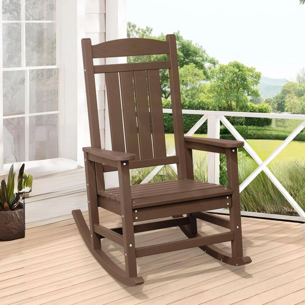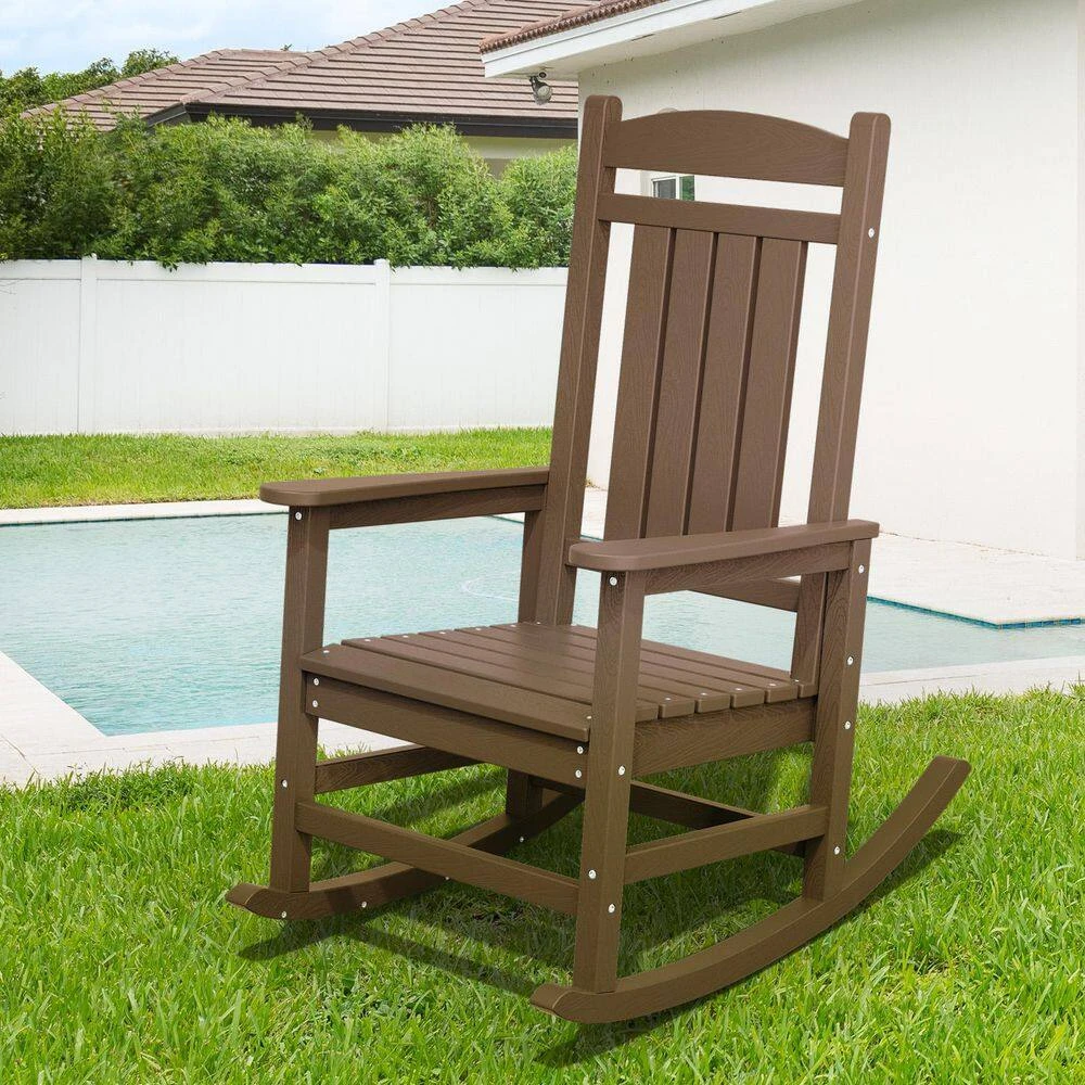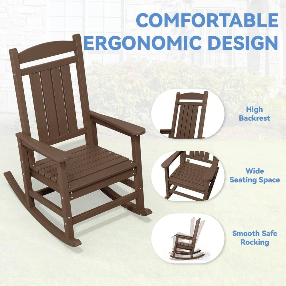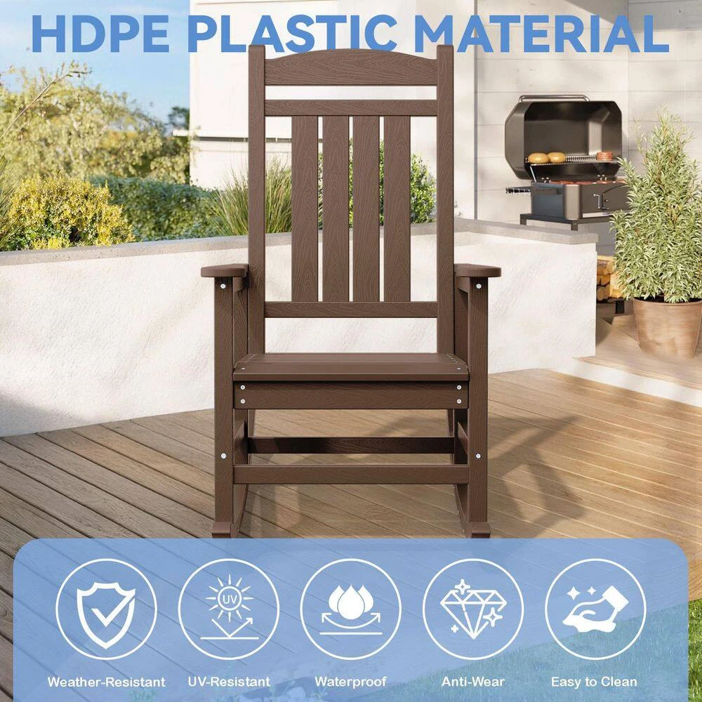 The Outdoor Slat Rocking Chair is made of durable HDPE material , ensuring it’s all-weather resistant, fade-proof, and waterproof. It features a contoured seat, widened armrests, and a slatted backrest for ultimate relaxation. With a 360lbs weight capacity , it’s suitable for most adults. The chair has a streamlined slat-structure design, ergonomic curved structure, and attached stainless steel screws for added durability. It’s easy to maintain, requiring only water and soap . The chair comes with all necessary hardware and can be assembled in 30 minutes . It’s available in multiple colors , including navy blue, gray, brown, black, and white, and its classic style blends perfectly into any decor.