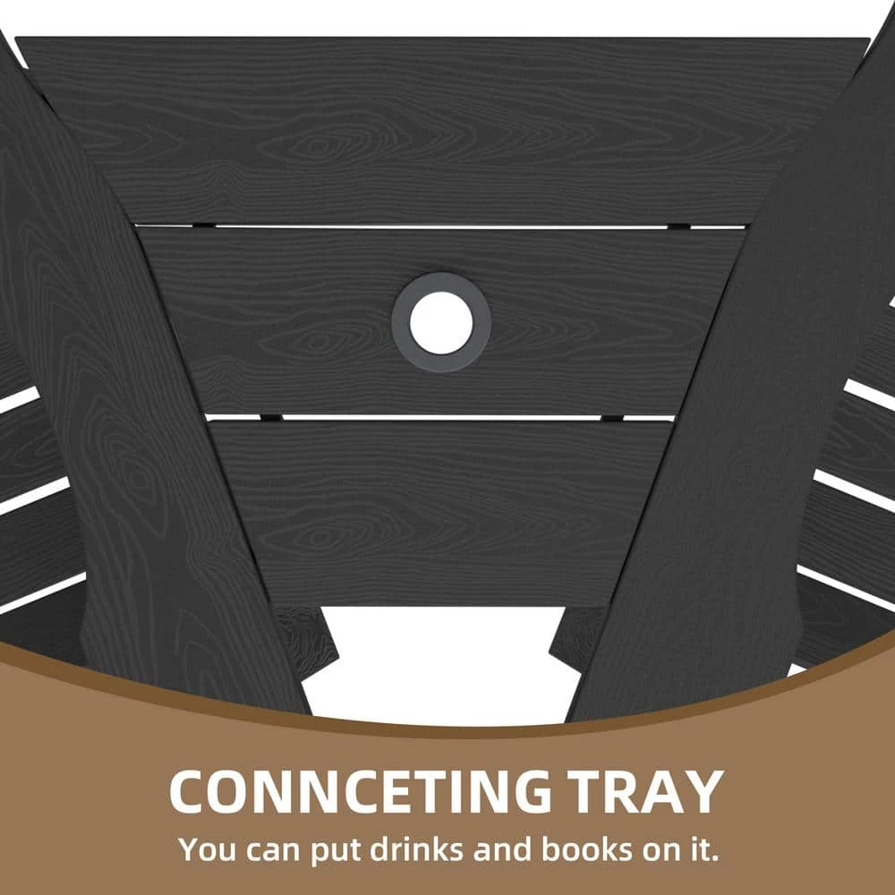 - Detachable tray with a cut-out hole the removable connecting tray between the arms of the dual Adirondack balcony chairs adds an extra room for a few cups of drinks, snacks, holds up to 33 lbs., a 2 in. Dia hole in the center of the tabletop makes it possible to put up your umbrella