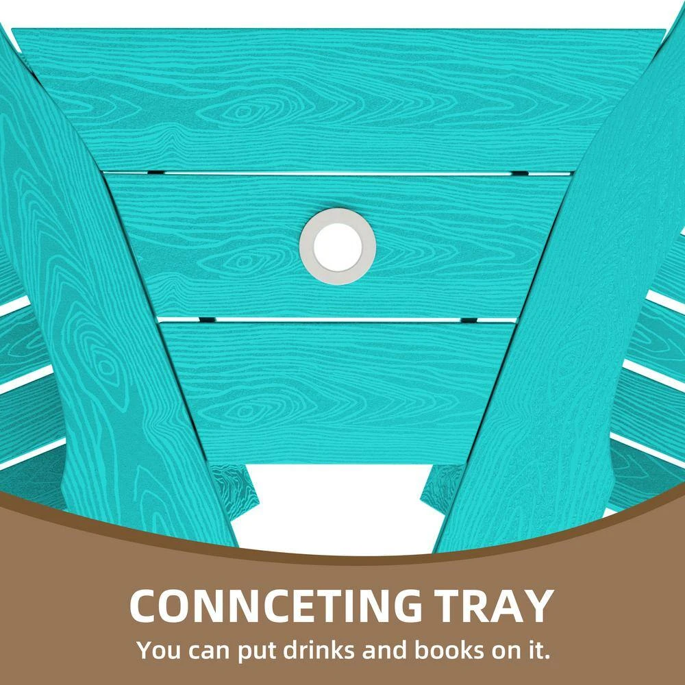 - ?Detachable Tray with a Cut-Out Hole?The removable connecting tray between the arms of the dual Adirondack balcony chairs adds an extra room for a few cups of drinks, snacks,holds up to 33lbs. A 2 inch diameter hole in the center of the tabletop makes it possible to put up your umbrella.