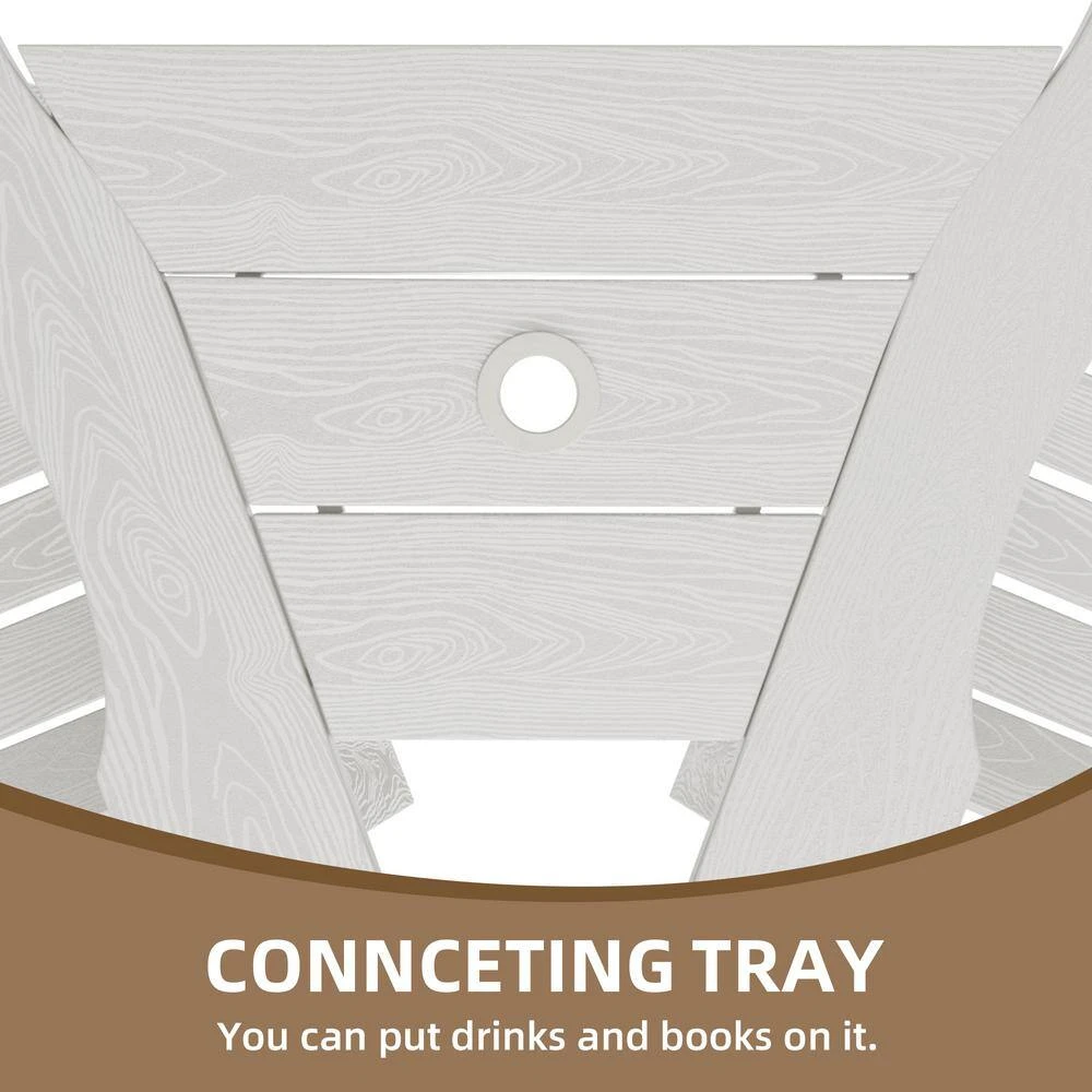 - ?Detachable Tray with a Cut-Out Hole?The removable connecting tray between the arms of the dual Adirondack balcony chairs adds an extra room for a few cups of drinks, snacks,holds up to 33lbs. A 2 inch diameter hole in the center of the tabletop makes it possible to put up your umbrella.