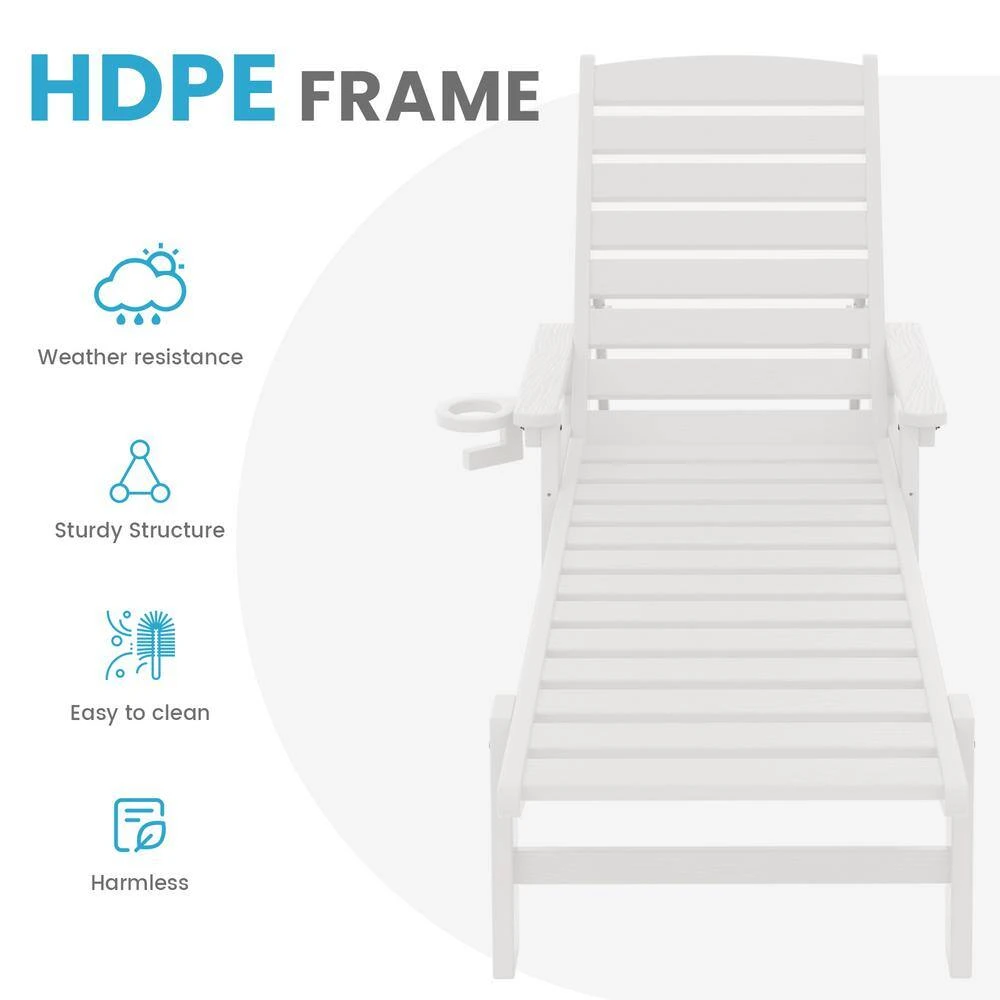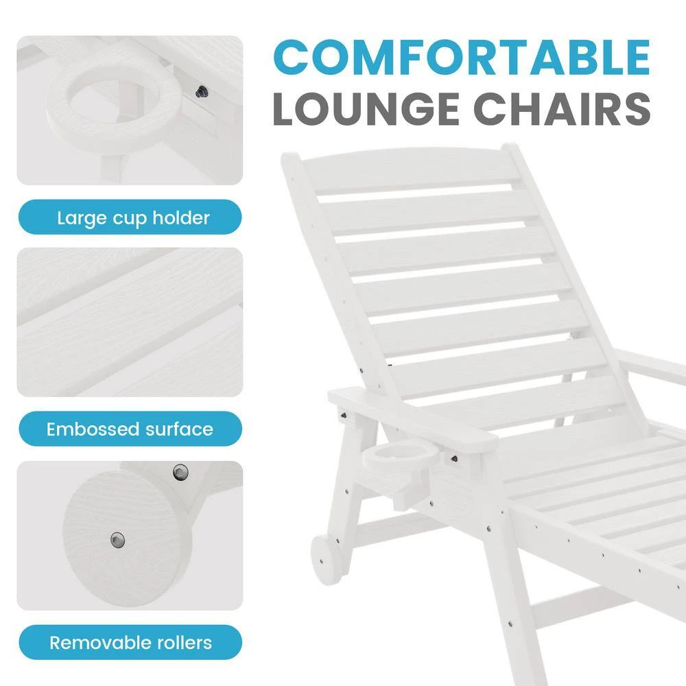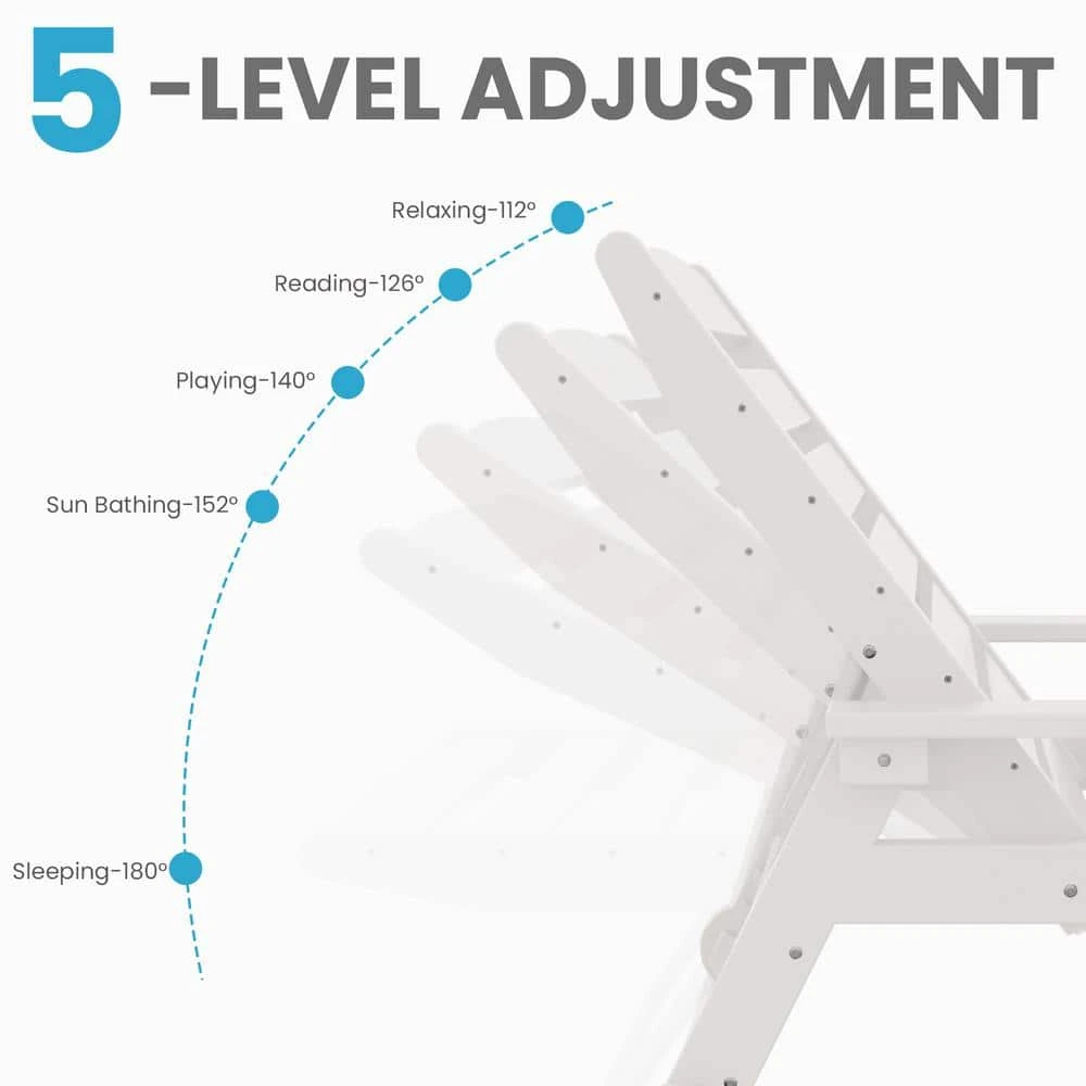 5 Position Adjustable Backrest: The backrest of the patio lounge chair with 5 position to adjust, allows you to find the perfect position for relaxation. Whether you’re looking for a cozy spot to read, nap, or sunbathe, it allows you to find the ideal angle for these activities. The HDPE adjustable patio lounge chair with wheels is available in various colors, allowing you to choose a chair that matches your outdoor decor. Its modern design makes it a comfortable and practical addition to any outdoor space.