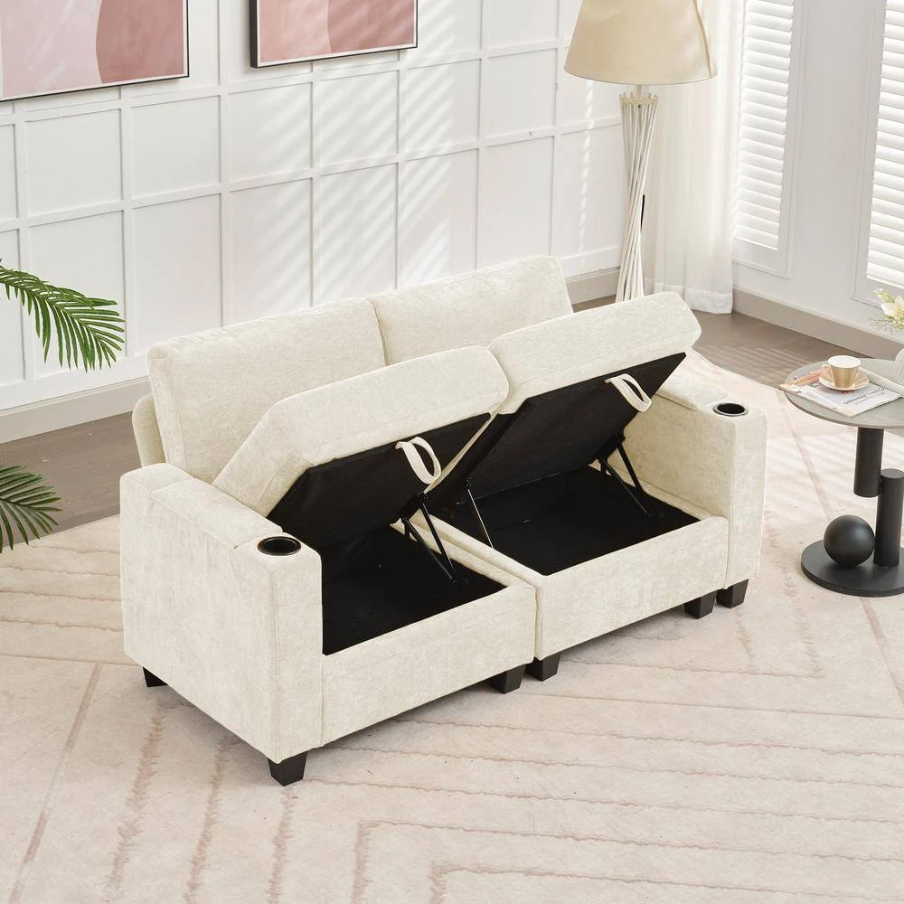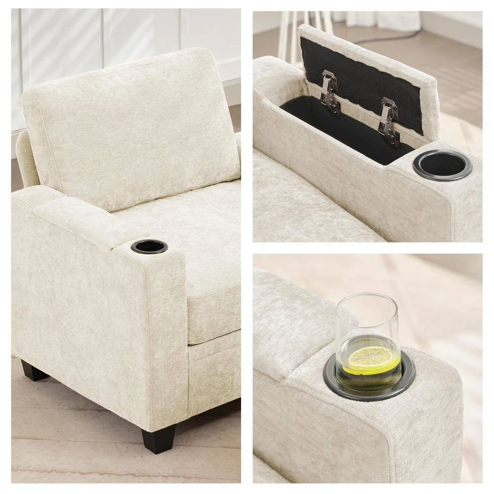 Modern 64.6 In Beige Chenille Storage Loveseat With Cup Holder And Ottoman For Living
