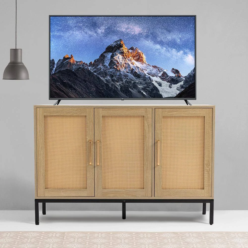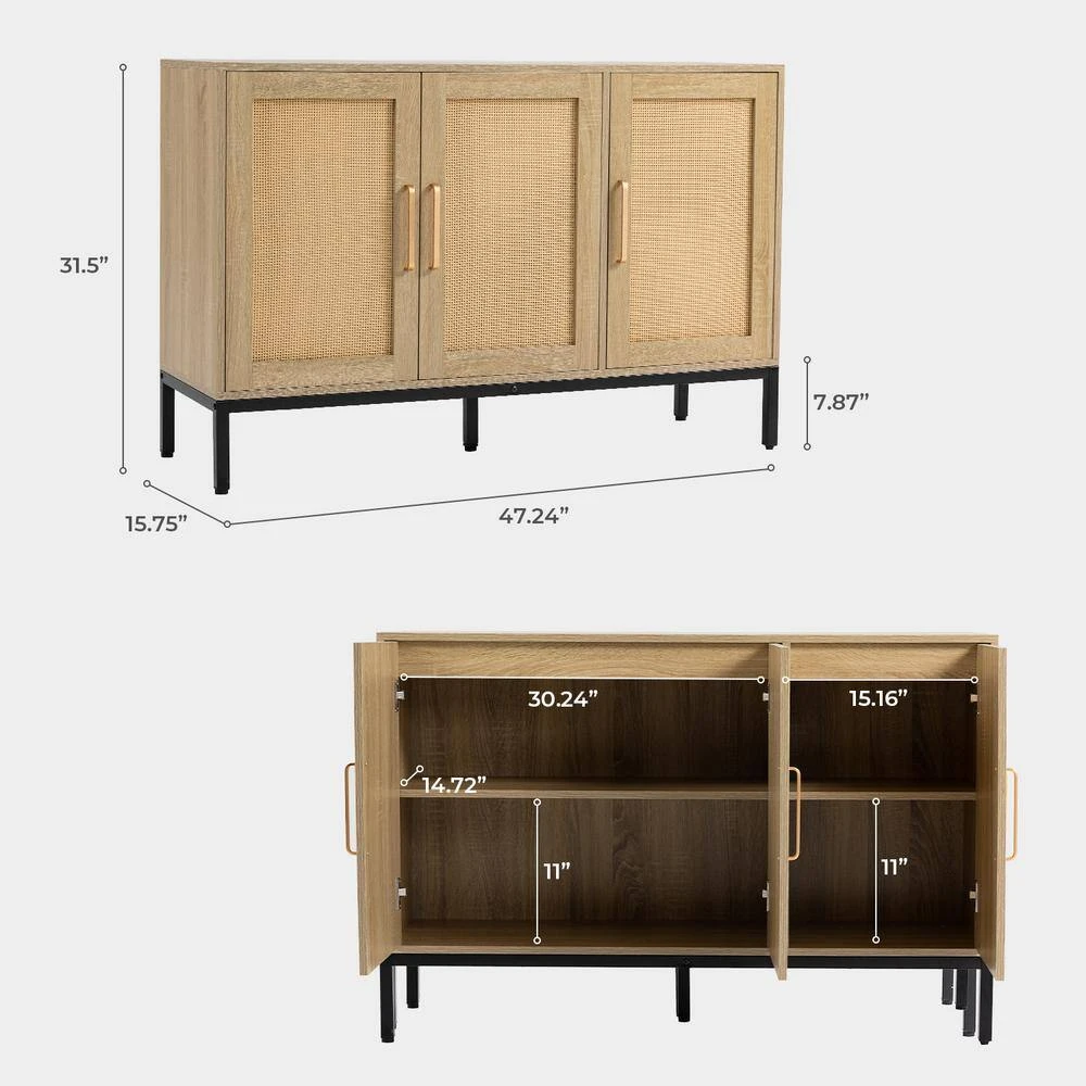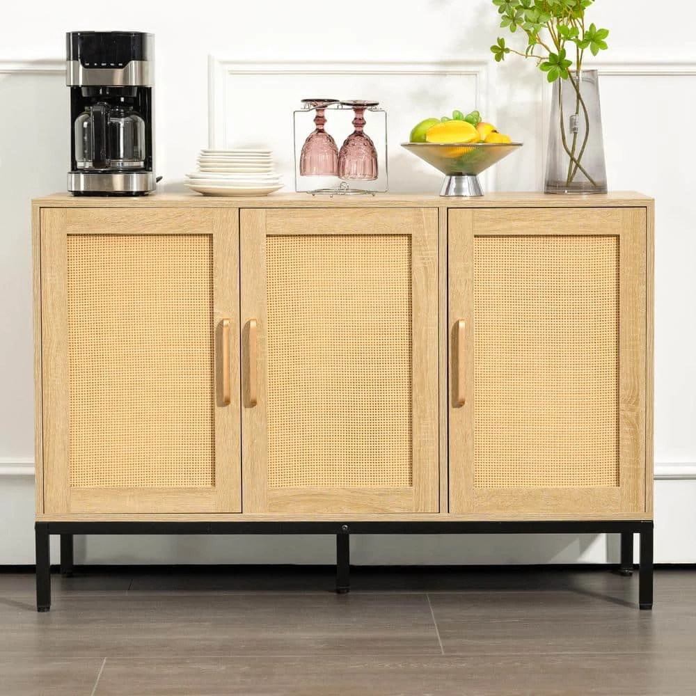 With its sleek, space-saving design, this sideboard will add character to your room in minutes. The rattan-decorated cabinet door combines beauty and practicality. It is made of natural rattan with hand-woven technique, natural rattan not only has the effect of absorbing moisture and heat, but also brings perfect visual effect to add charm to your home. It is more substantial than ordinary storage sideboards, increasing the value of your purchase. Extra-large storage space with built-in shelves and wide tabletop maximizes your storage space. Our storage sideboards are made of quality wood and metal legs for long-life. The storage sideboard is easy to store and organize your room. The 3-door cabinet design provides plenty of hidden storage space. You can place it in your dining room for dishes, in your living room for your record player or in your entryway to greet guests.