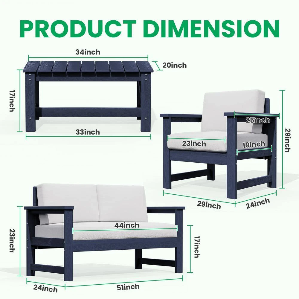 Transform your outdoor space with the Conversation Set. It includes a loveseat, 2-accent chairs, and a convenient coffee table, all designed for comfort and durability. The HDPE construction ensures weather resistance, while the cushions offer ultimate relaxation. This set is also easy to assemble, perfect for your patio, garden, or balcony. Whether hosting guests or enjoying a quiet afternoon, our conversation set provides both elegance and functionality to elevate your outdoor experience.