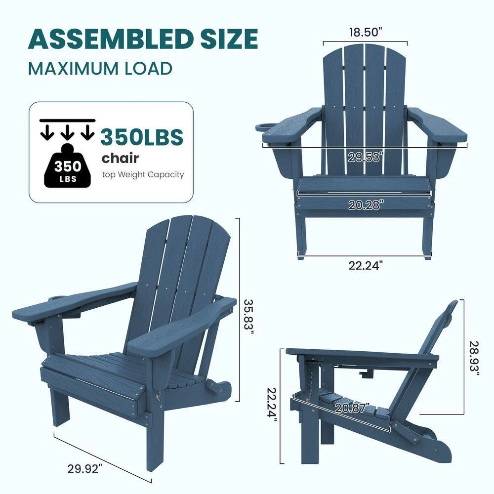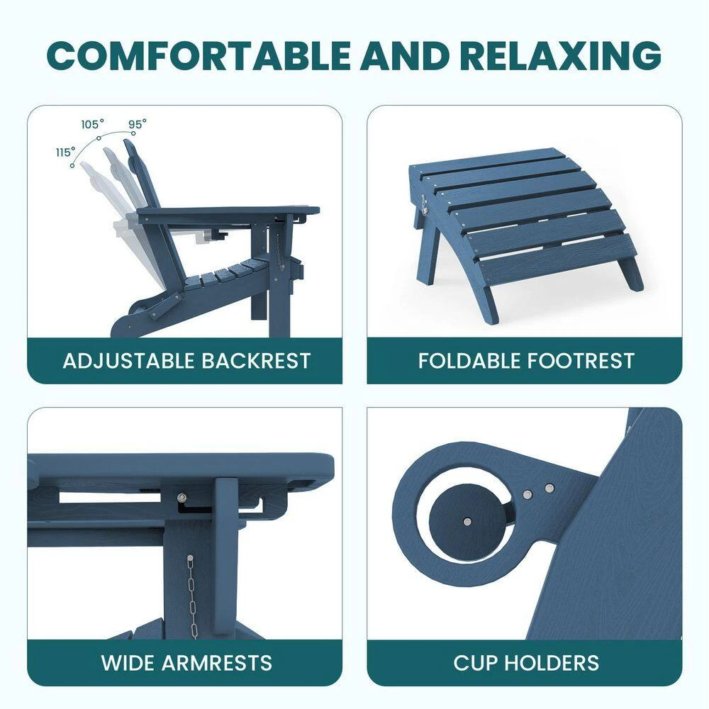 Our HIPS Folding Reclining Plastic Adirondack Chair Set with Ottoman and Table will create a cozy getaway right outside your home. Made with a weather-resistant composite, this Patio Chat Set brings a beautiful rustic influence to your backyard or patio and tops it off with a sleek modern finish, it matches perfectly for any deck, patio, or poolside relaxation to create a charming space for all to enjoy. Different with HDPE material, our HIPS chair set has the traditional deluxe texture of solid wood, but perfectly improves the shortcomings of solid wood, which is easy to decay, crack and mold, especially in rainy days. We choose this material to make sure that you can use it longer and more worry-free. Designed with 3 adjusted position to meet different comfortable needs, and with foldable Ottoman, when you don’t want to use ottoman, it can be folded and hided under the chair for storage. The side table has a slat-top surface. All contents are packed in 1 box. Light assembly required.