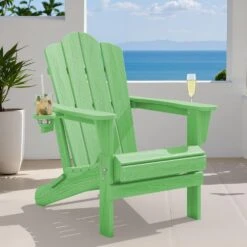 Classic Outdoor HDPE Folding Plastic Adirondack Chair With 2 Cup Holders In Light Green (Set Of 1)