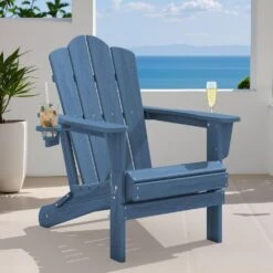 Classic Outdoor HDPE Folding Plastic Adirondack Chair With 2 Cup Holders In Navy (Set Of 1)